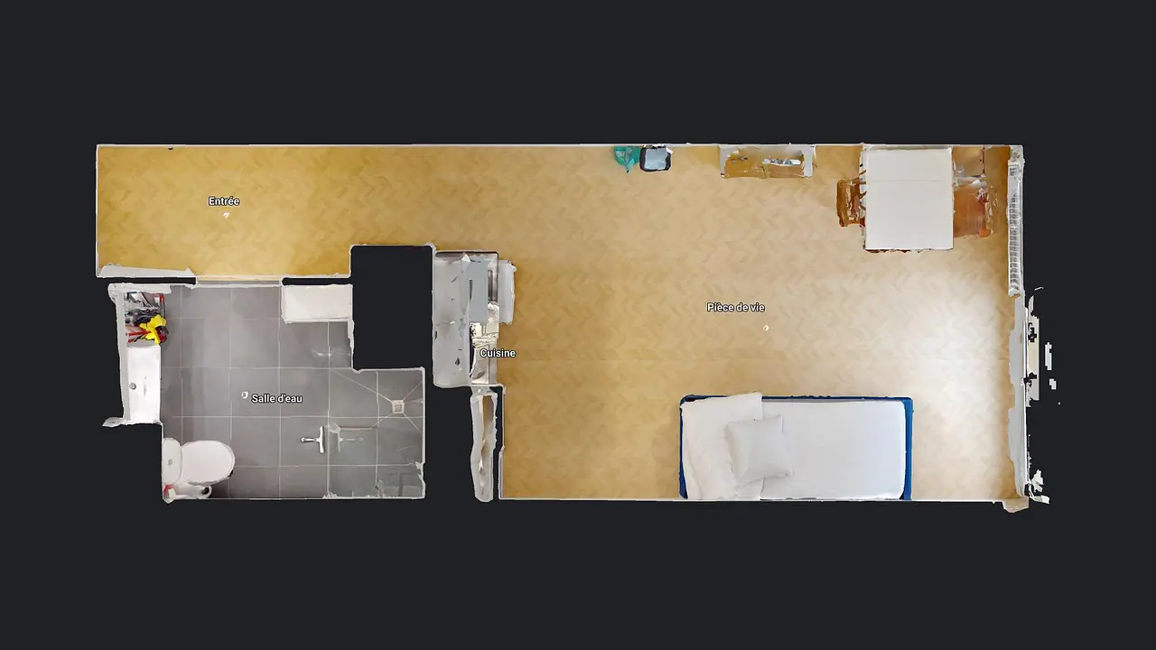 Cet appartement comporte une pièce principale : un salon avec un coin cuisine équipée d'un mini-four ainsi que d'une plaque de cuisson à laquelle s'ajoute une salle de bains avec douche et meuble vasque.