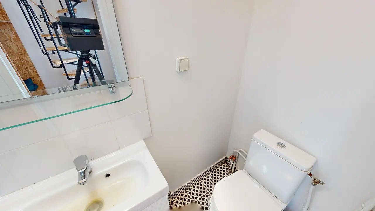 L'étage inférieur dispose de rangements, d'un miroir et d'une salle d'eau privative avec cabine de douche, meuble vasque, miroir et WC