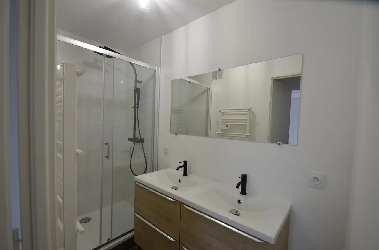 🚿 La salle de bain est pratique et agréable avec sa double vasque et sa douche moderne. Les toilettes sont séparées pour plus de confort au quotidien.
