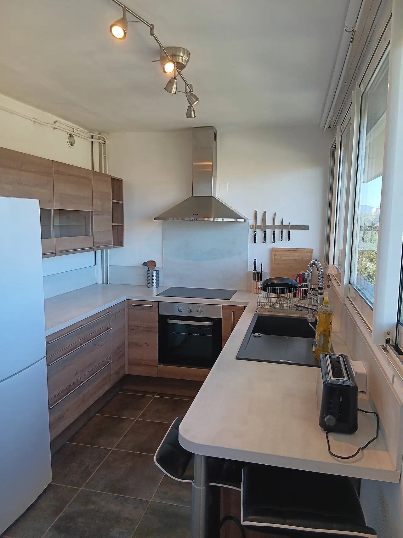 La cuisine est équipée d'un four, de plaques de cuisson, d'une hotte, d'un réfrigérateur avec congélateur, d'un évier, d'un lave-vaisselle, de nombreux rangements, d'une table haute avec 2 chaises et de tous les ustensiles et le petit électroménager nécessaire.
