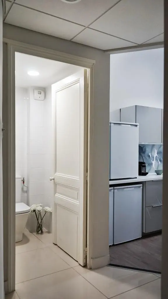 La cuisine est entièrement équipée avec un four, un micro-ondes et des plaques de cuisson. Afin de garantir une indépendance totale, chaque colocataire dispose de son propre réfrigérateur individuel (4 réfrigérateurs au total) situés dans cet espace.