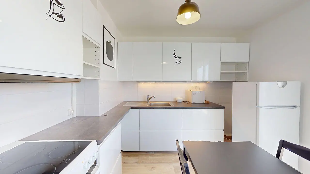 La cuisine, séparée, est équipée d'un four, de plaques de cuisson, d'une hotte, d'un évier, d'un réfrigérateur avec compartiment congélateur ainsi que de rangements et ustensiles de cuisine. Elle donne également accès au balcon.