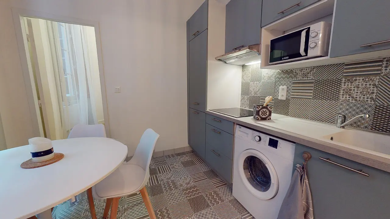 Le salon dispose d’un canapé et d’un fauteuil, de part et d’autre d’une table basse qui fait face à un la télévision. On aime la touche de déco et le choix des luminaires. La pièce ouvre sur la cuisine entièrement équipée : plaques de cuisson avec hotte, micro-onde, machine à laver, frigo intégré et nombreux espaces de rangements. La table et les 4 chaises complètent le mobilier.