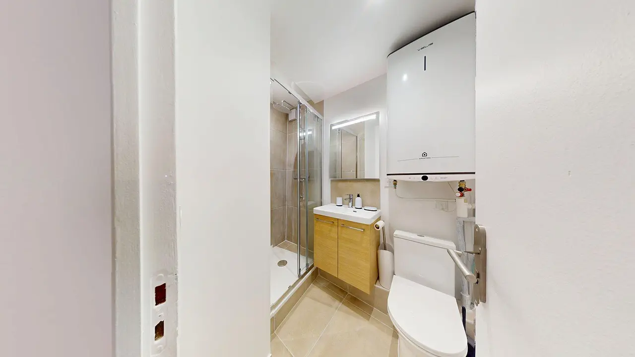Enfin, la salle d'eau moderne et fonctionnelle comprend une douche spacieuse, un meuble vasque avec miroir ainsi que les WC.