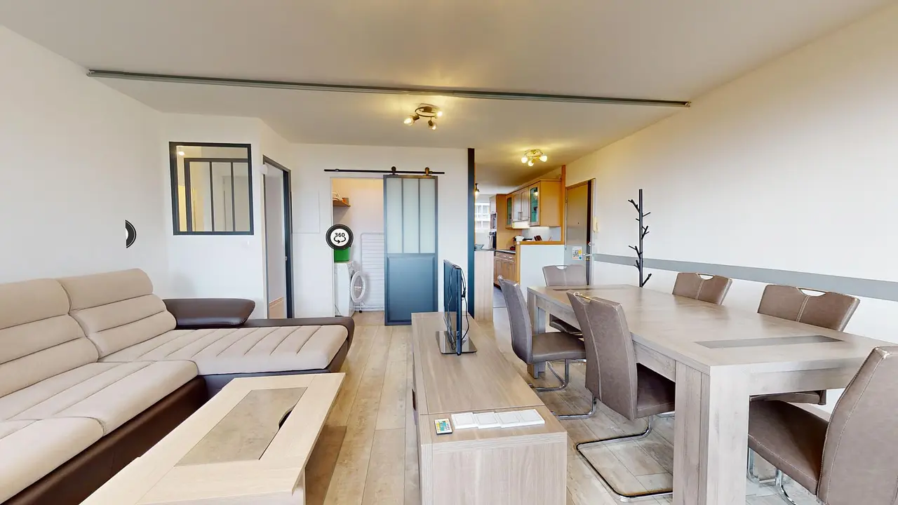 L'entrée de la colocation donne sur une belle pièce de vie aménagée avec un canapé king size, TV et meuble TV : idéal pour vos soirées télé. Vous aurez aussi une grande table à manger 6 places ainsi qu'un accès balcon.