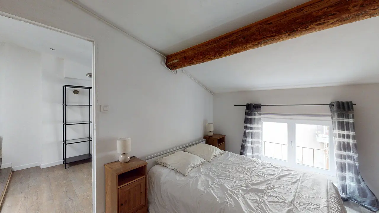 Accessible directement depuis le séjour, la chambre est meublée avec un lit double, deux tables de chevet, des lampes, un dressing et une fenêtre double vitrage avec rideaux. Le tout dans un esprit minimaliste et lumineux, avec parquet au sol et poutres apparentes.