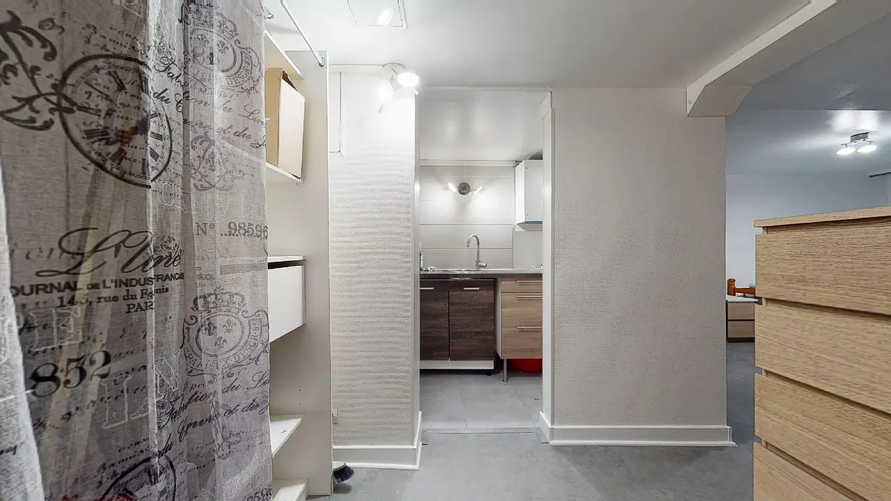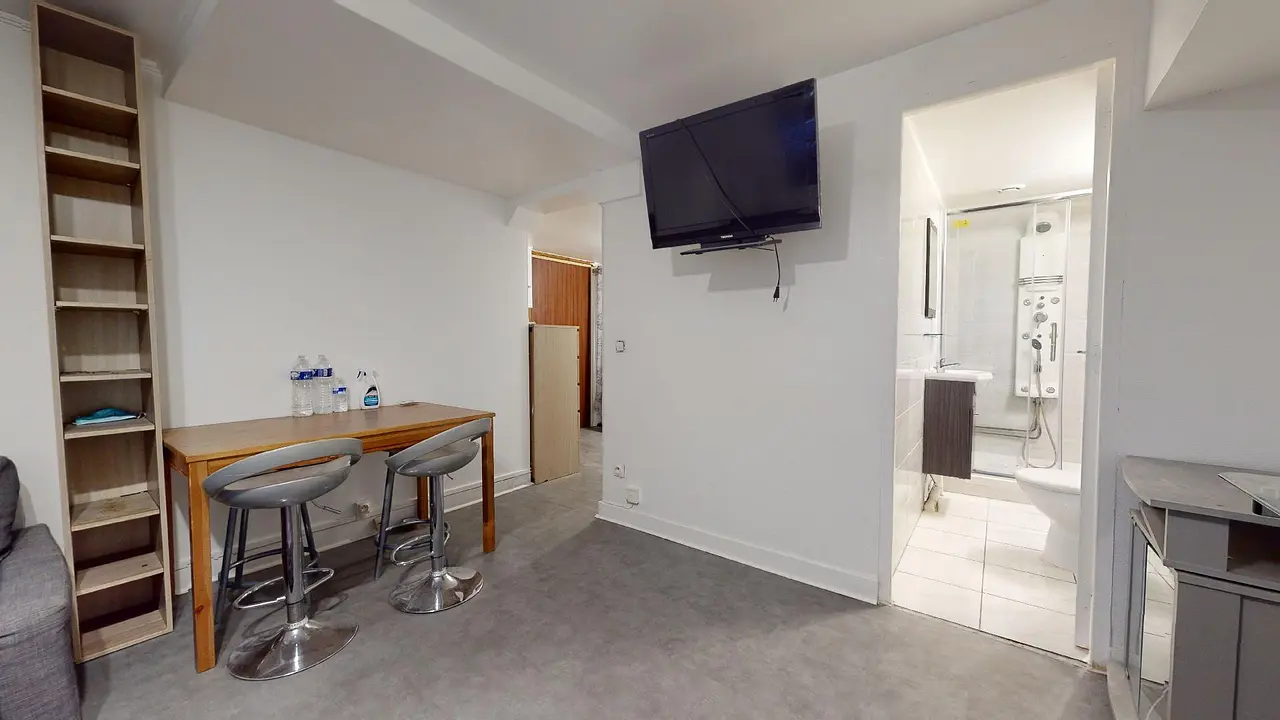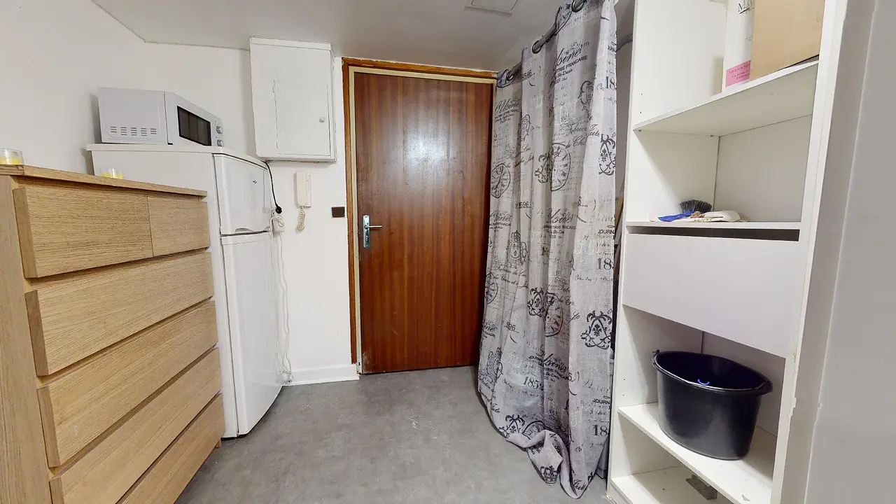 La porte d’entrée de ce T1 s’ouvre sur un vestibule composé de nombreux rangements.