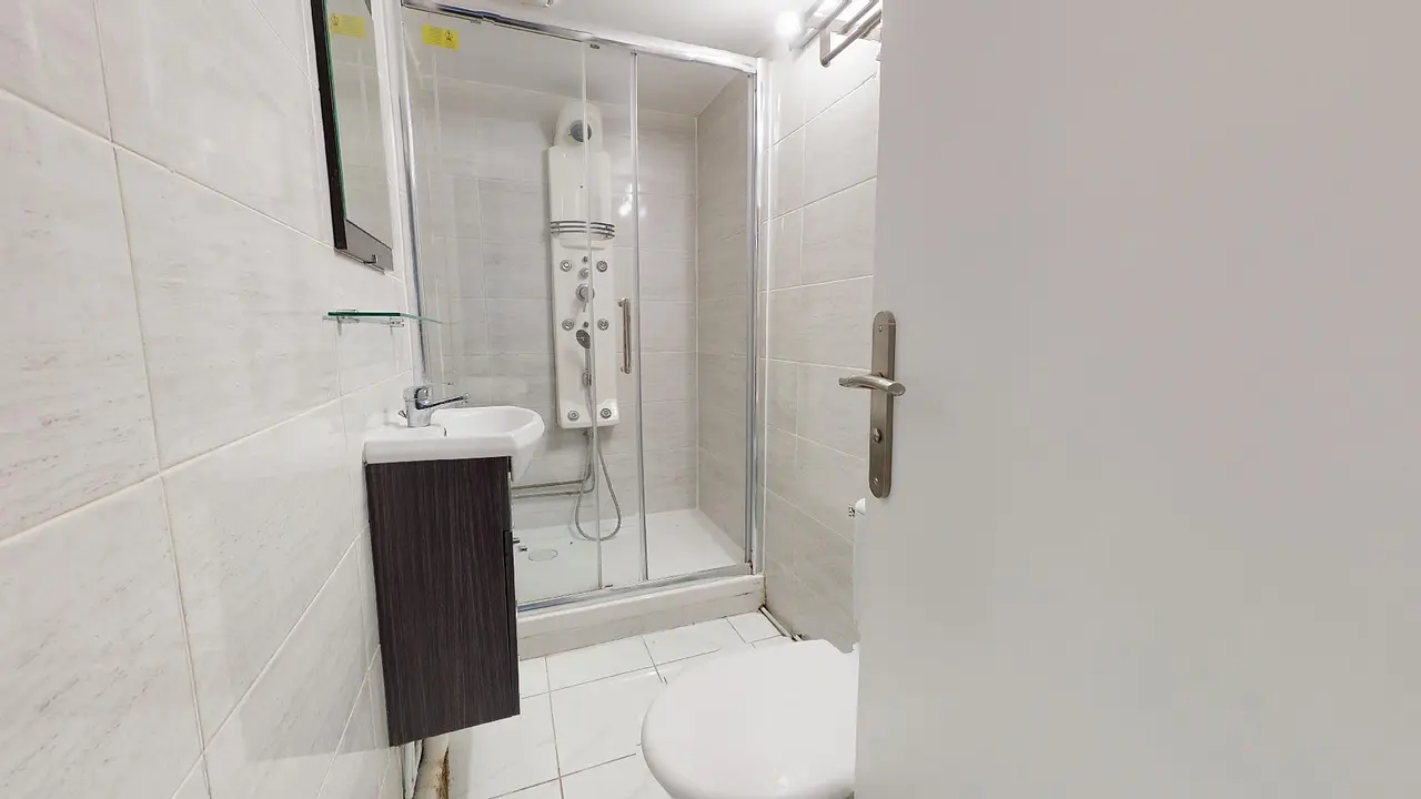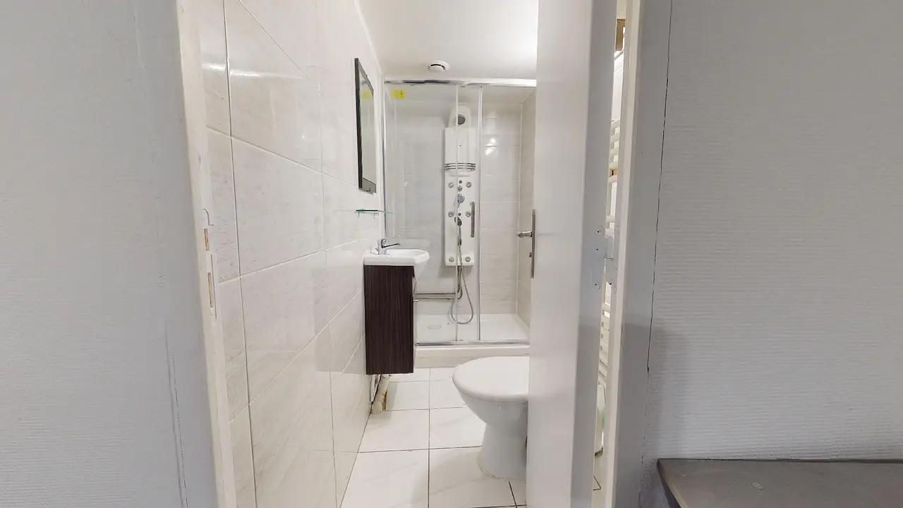 La salle de douche avec WC est équipée d’un meuble vasque avec miroir et d’une douche hydro massante.