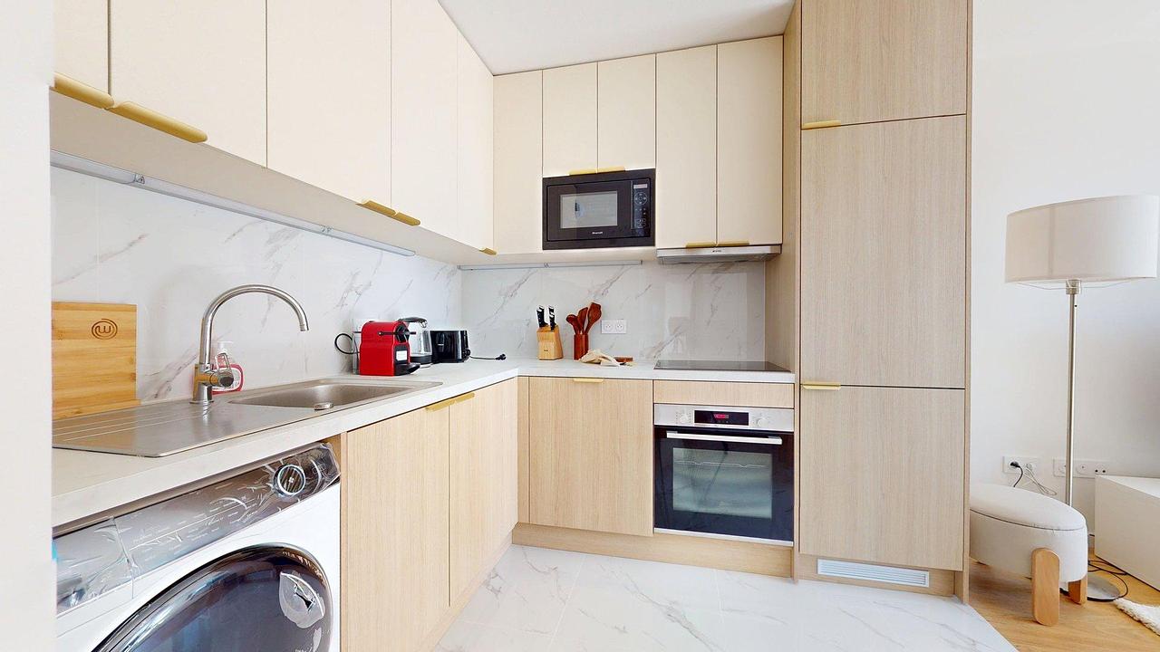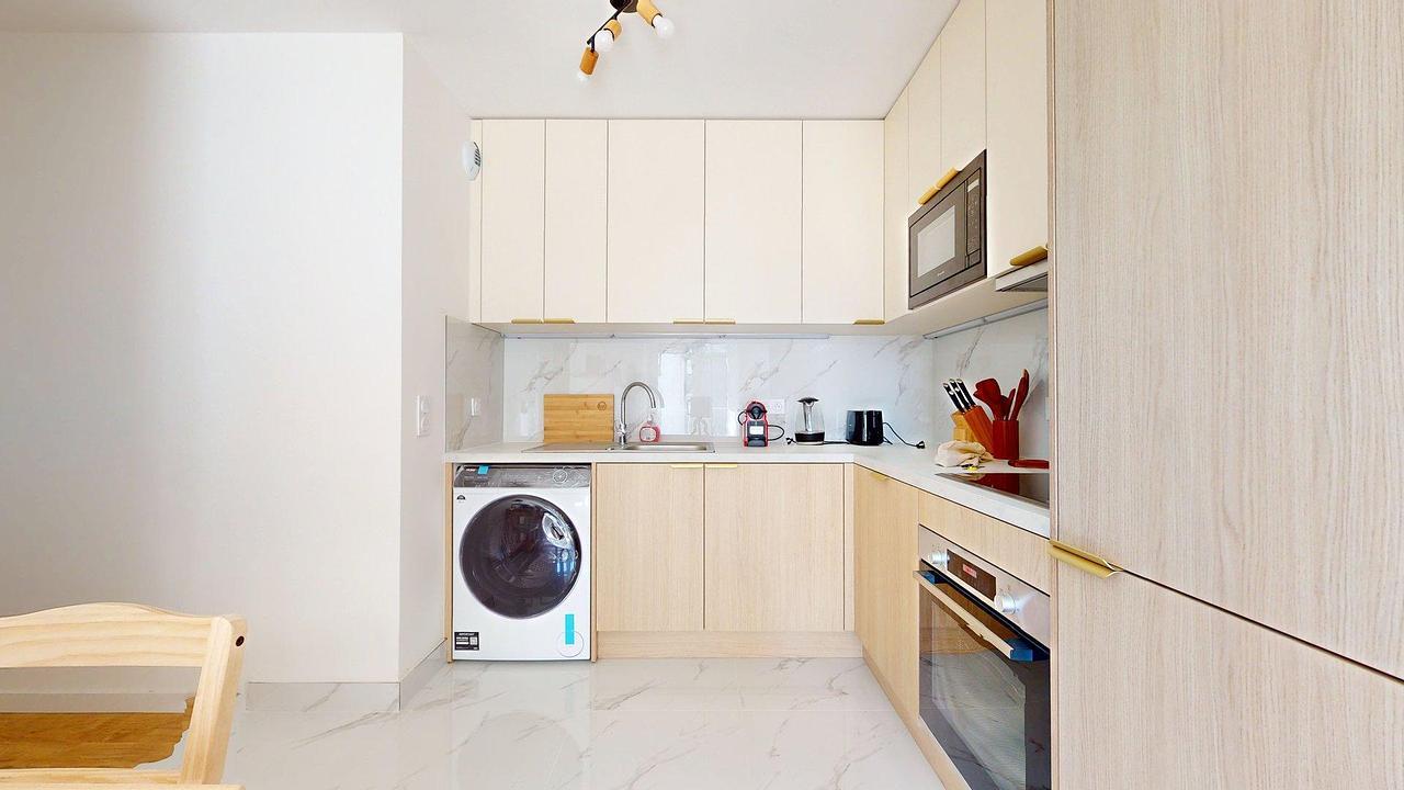 La cuisine ouverte est équipée d'un four, d'un micro-ondes, de plaques de cuisson, d'une hotte, d'un évier, d'un réfrigérateur avec compartiment congélateur, lave-vaisselle, machine à laver qui fait sèche-linge, ainsi que de nombreux rangements et ustensiles de cuisine.