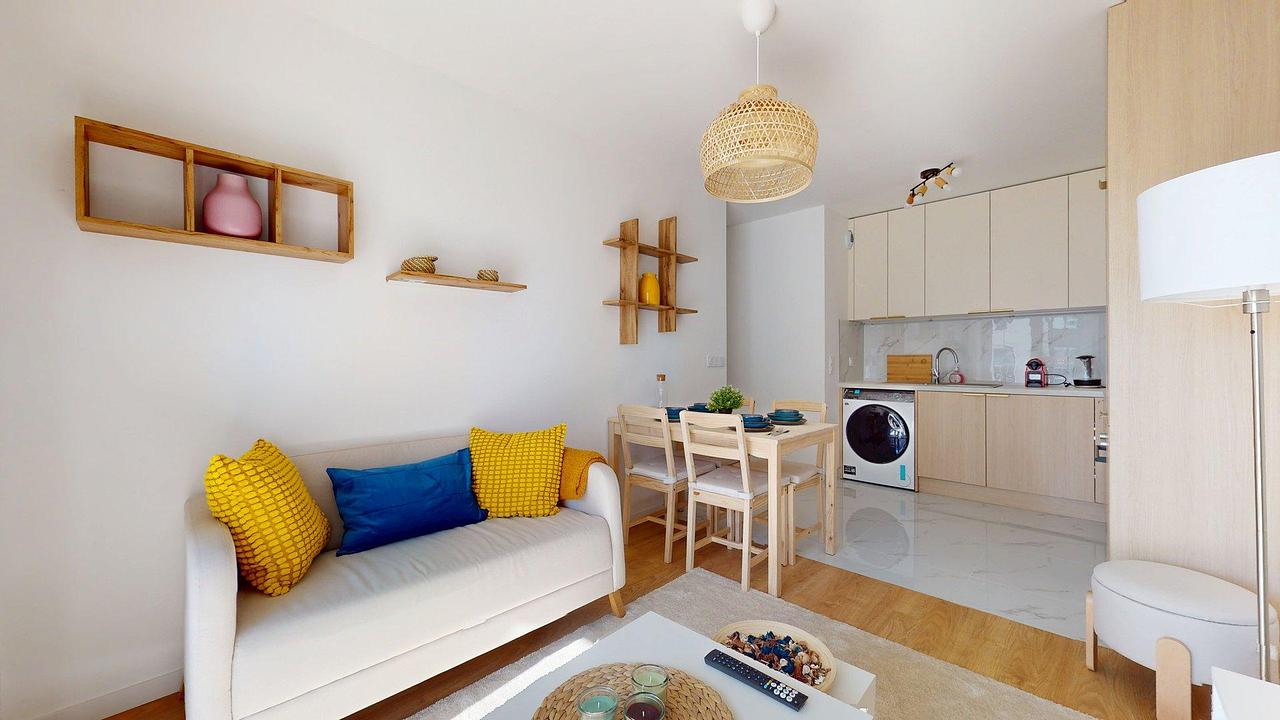 La pièce de vie est meublée avec un canapé, une table basse, un meuble télévision, une télévision, une table à manger pouvant accueillir 4 personnes ainsi que des rangements. Elle s'ouvre par une baie vitrée sur un joli balcon équipé d'une table et de deux chaises pour profiter du bon air.