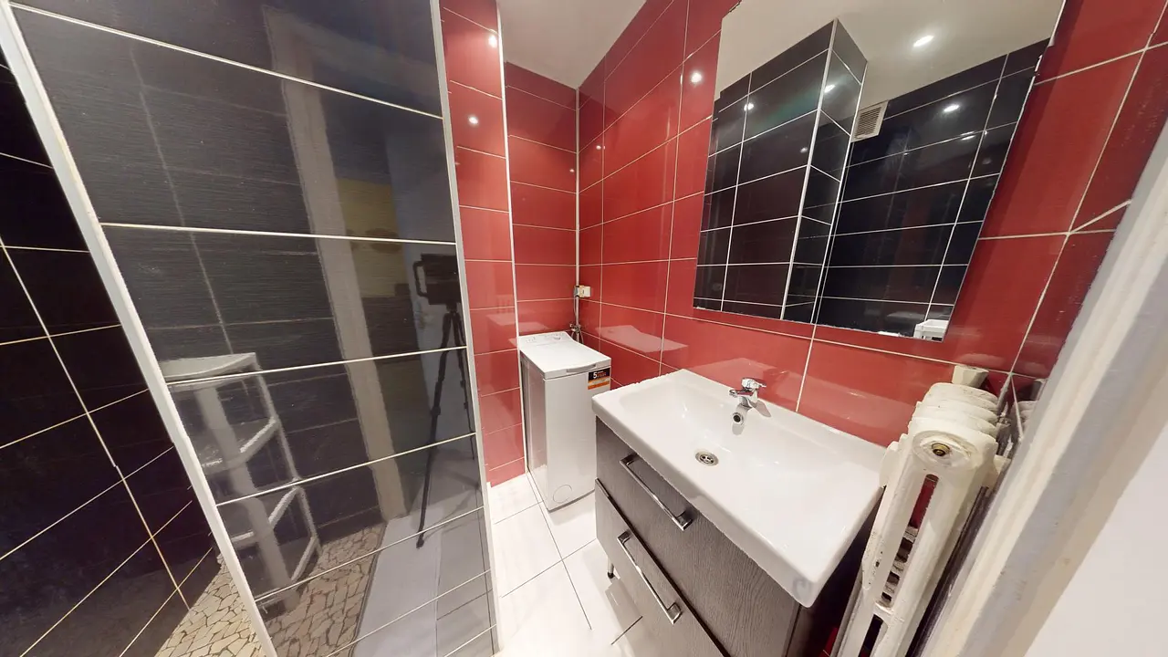 Salle de bain carrelée avec douche italienne, meuble vasque et lave-linge
