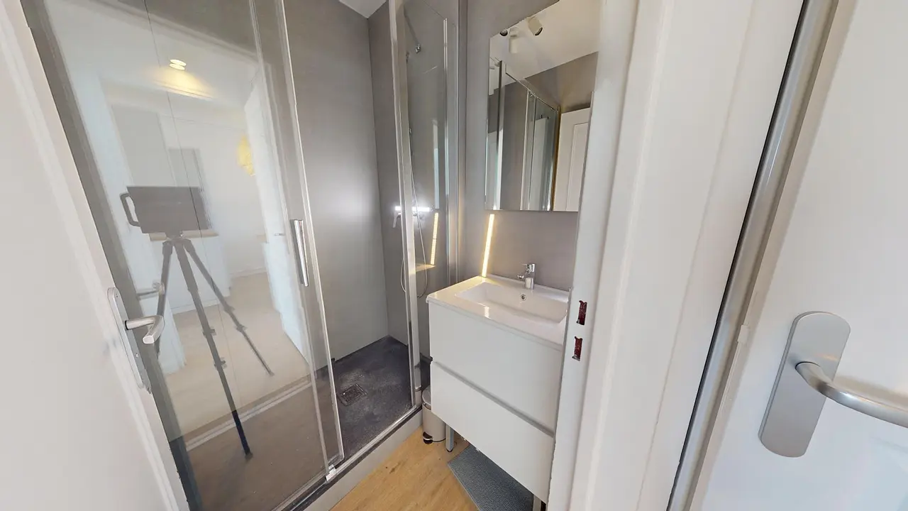 - D'une première salle de bain, équipée d'une douche et d'un meuble vasque.