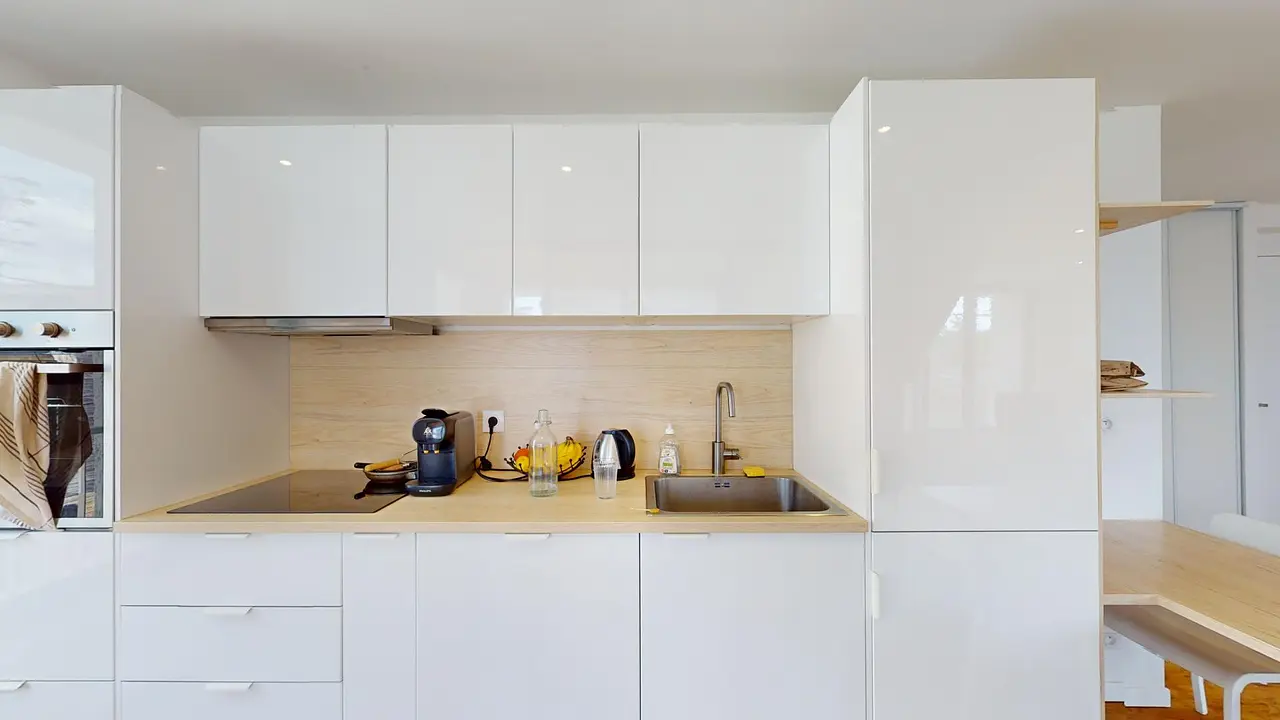 Une cuisine équipée ➩ cafetière, plaque à induction, un four, réfrigérateur, micro-ondes, lave-vaisselle, bouilloire, meubles.