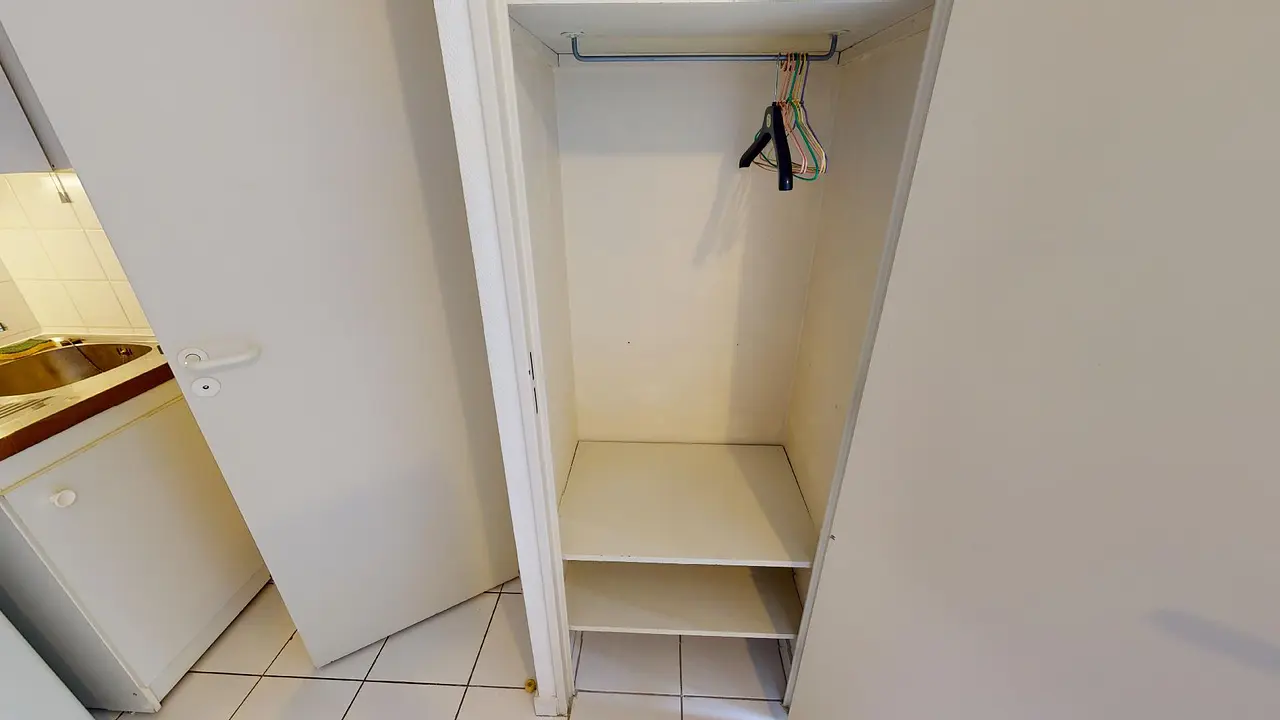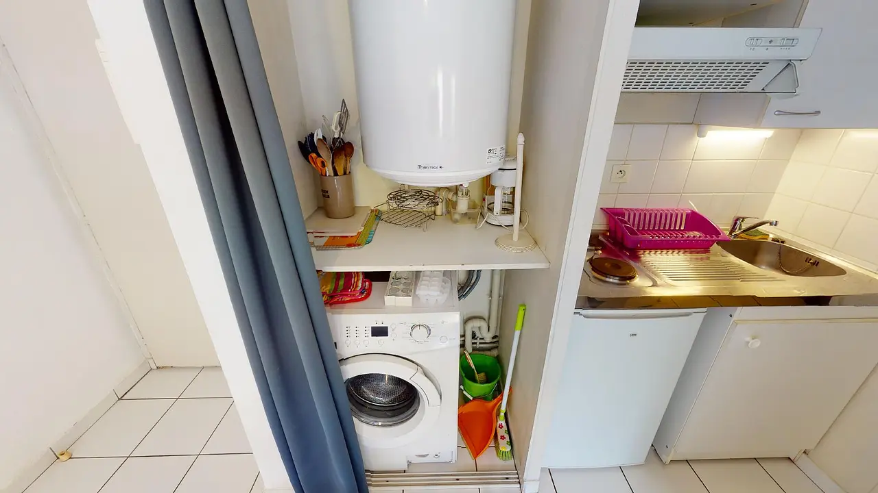 Le studio est organisé en une grande pièce de vie avec une kitchenette équipée (mini-four, plaques de cuisson avec hotte intégrée, micro-onde, frigo), une table, un bureau, de nombreux espaces de rangements, et un canapé convertible. Le studio est super lumineux, très fonctionnel et offre un bel espace de vie.