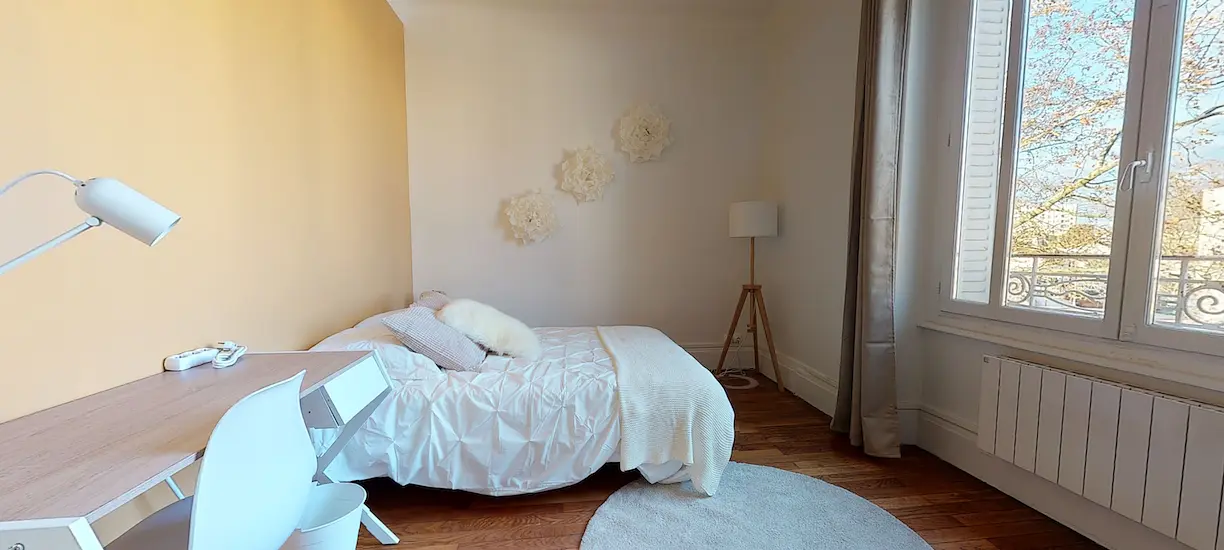 La chambre 1 de plus de 12m2 est très lumineuse grâce à sa grande double fenêtre et à son mur jaune pastel. Elle se compose d’un lit double, d’un bureau, d’une chaise et d’un placard avec plusieurs étagères