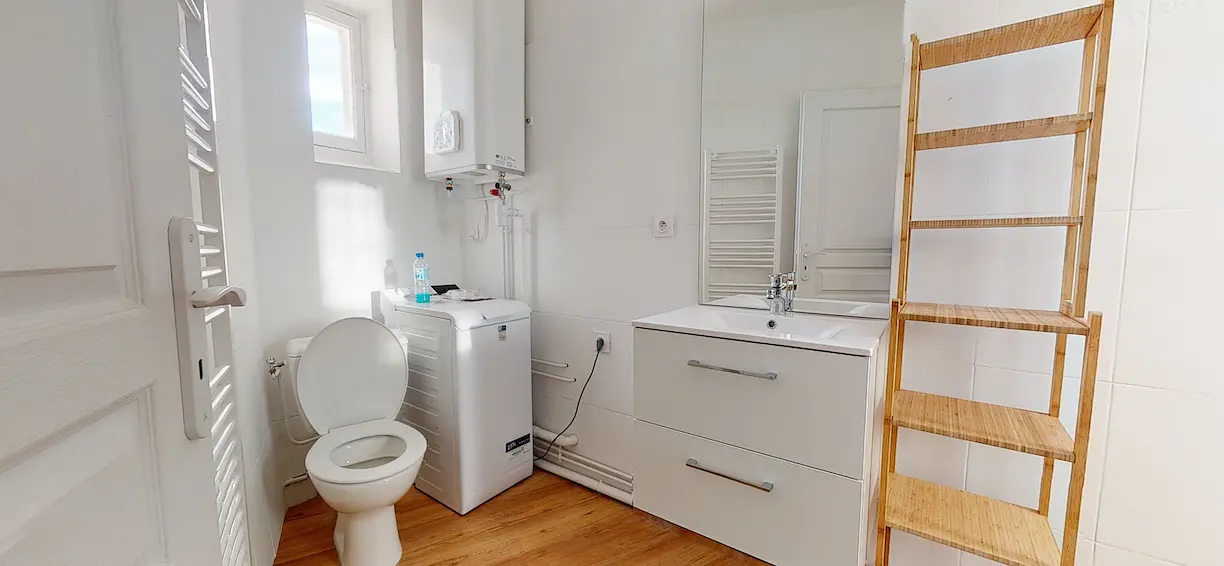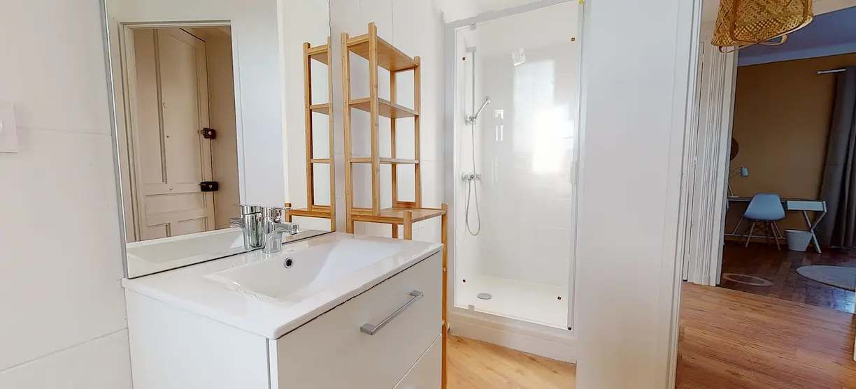 Une grande salle de bain avec cabine de douche, machine à laver et WC, située au niveau de l’entrée vient compléter cette colocation.
