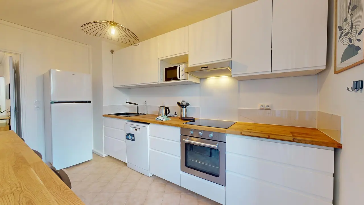 La cuisine est équipée d'un four, de plaques de cuisson, d'une hotte, d'un réfrigérateur avec congélateur, d'un évier, d'un lave-vaisselle, d'un micro-ondes, de nombreux rangements, d'une table haute avec 3 chaises et de tous les ustensiles et le petit électroménager nécessaire. Celle-ci est complétée par une loggia pour un supplément d'espace extérieur.
