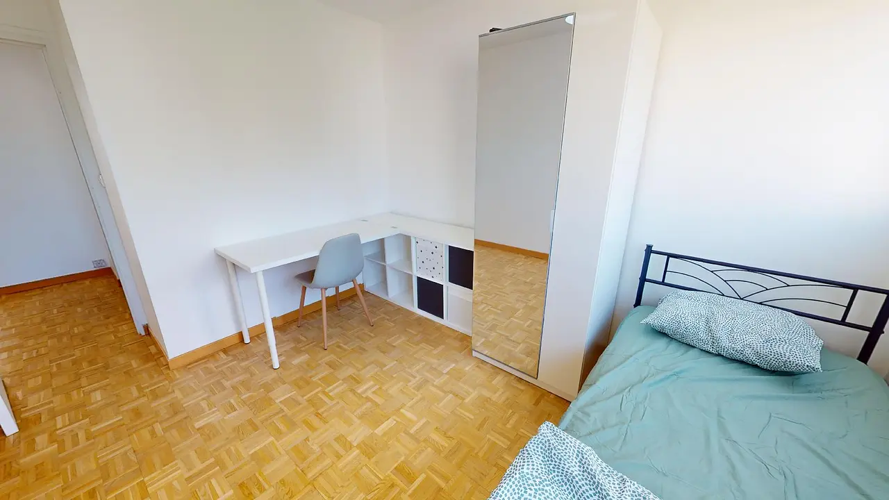 Cette chambre, la plus grande de la colocation, donne accès à un balcon privatif.