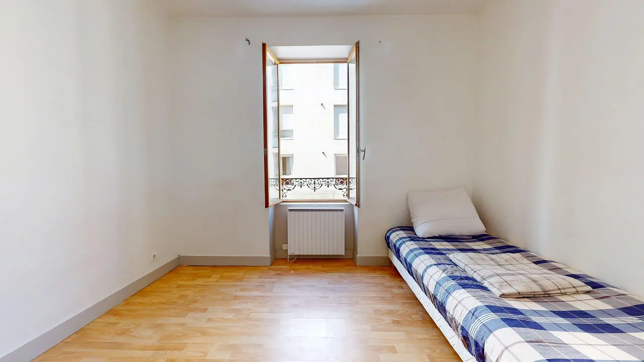 La chambre indépendante, côté rue, est sobrement aménagée avec un lit simple, une armoire ouverte et des rangements intégrés. Le sol en parquet et la grande fenêtre apportent chaleur et clarté à la pièce.