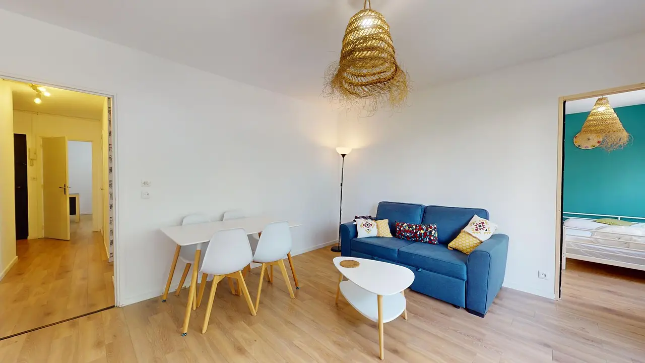 L'appartement s'ouvre sur une entrée avec rangements desservant un lumineux séjour. Celui-ci dispose d'un canapé, d'un fauteuil, d'une table basse, d'un meuble TV avec TV et d'une table avec 4 chaises.