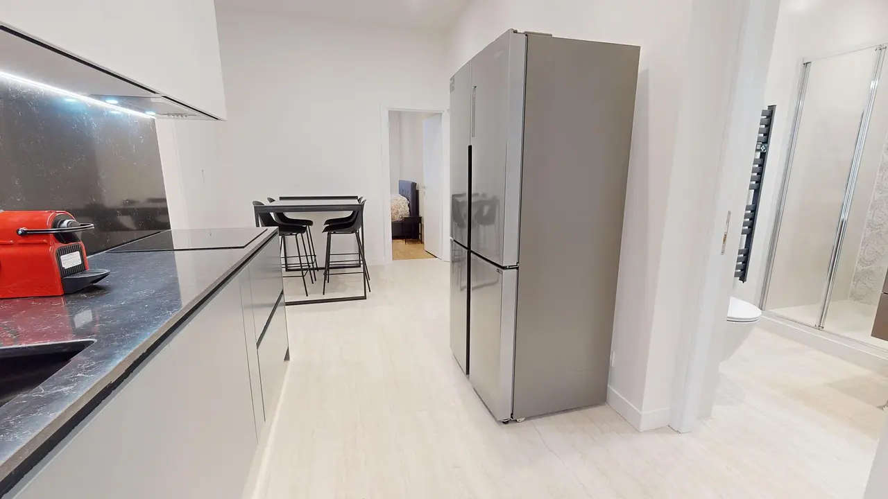 Cet appartement de 4 pièces inclut un salon avec un canapé, un fauteuil, une table à manger ainsi qu'une télévision, trois autres chambres, une cuisine et une salle de bains équipée d'une baignoire ainsi que d'une douche.