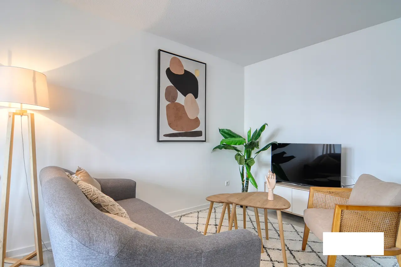 L'appartement possède une belle pièce de vie avec canapé, table basse, tapis, TV et meuble TV ainsi qu'un coin salle à manger avec table pour l'ensemble des colocataires. La cuisine est ouverte et équipée avec four, plaque de cuisson, hotte, frigo, ainsi que de nombreux rangements.