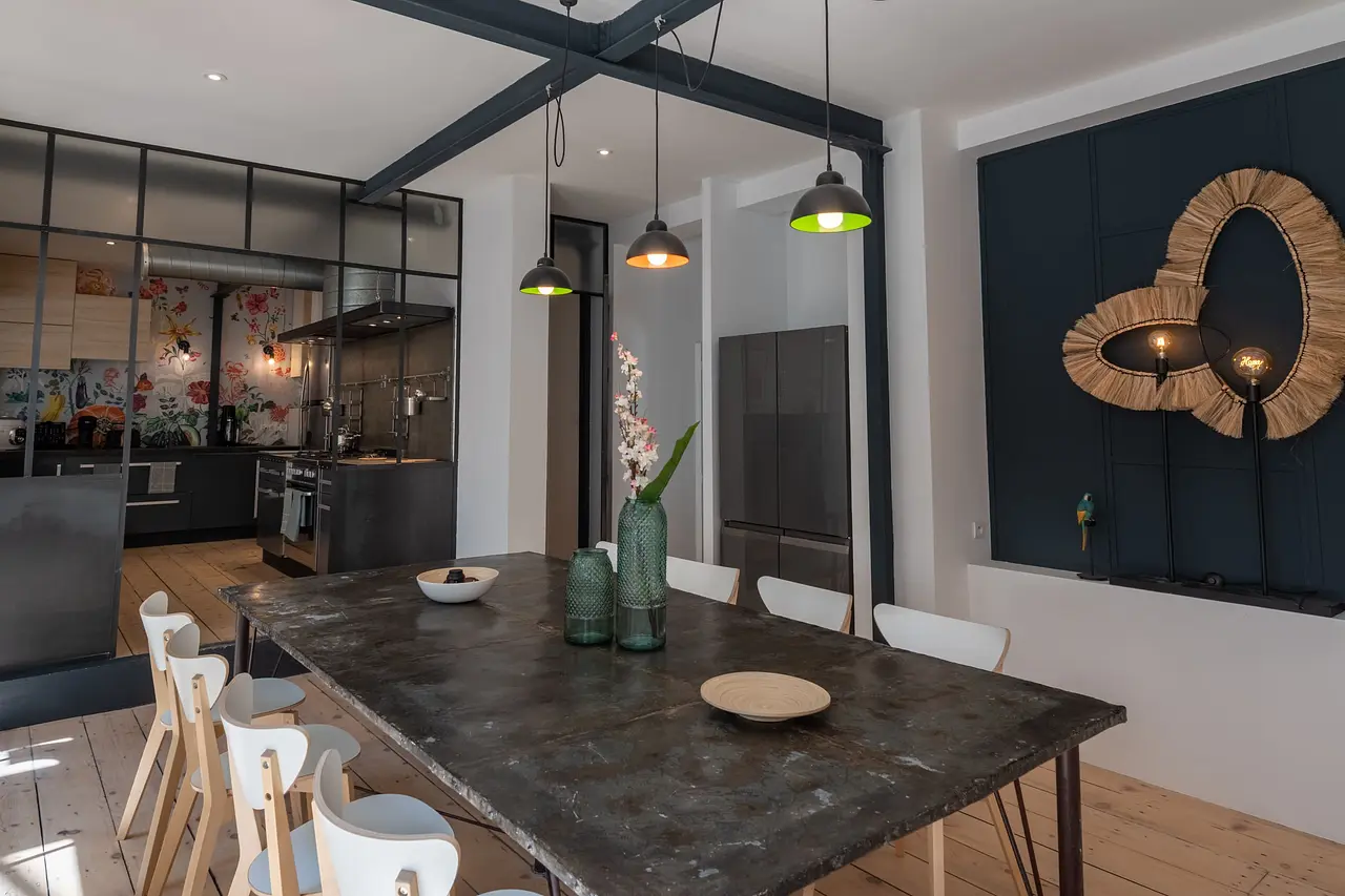 Il se compose de 10 chambres, 5 salles de bains dont deux privatives, trois wc et une buanderie. Grande pièce à vivre avec un coin coworking, deux cuisines, une belle salle à manger avec une table faite sur mesure.