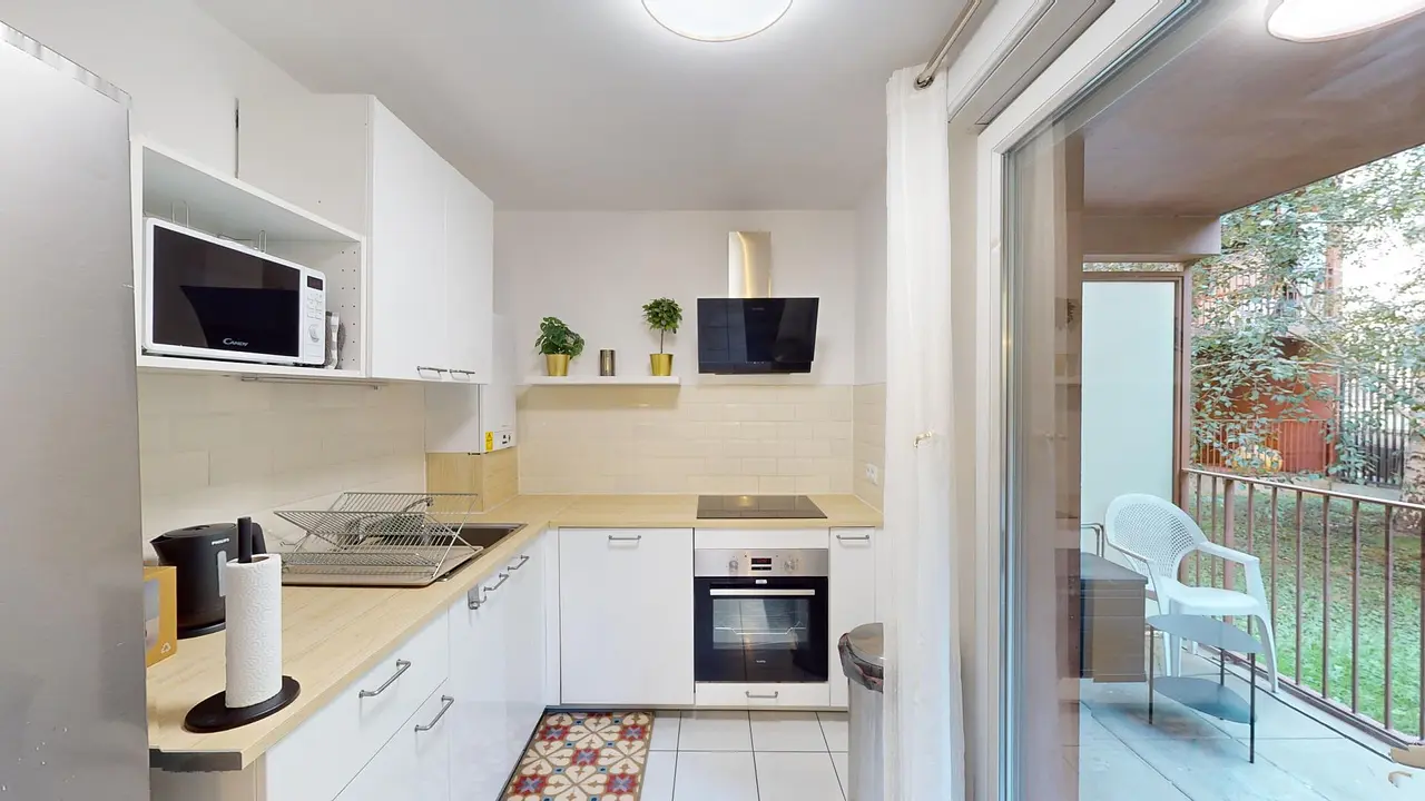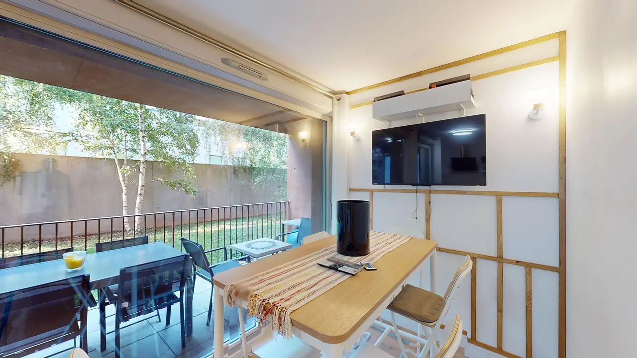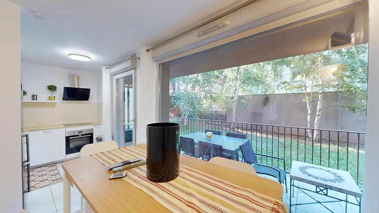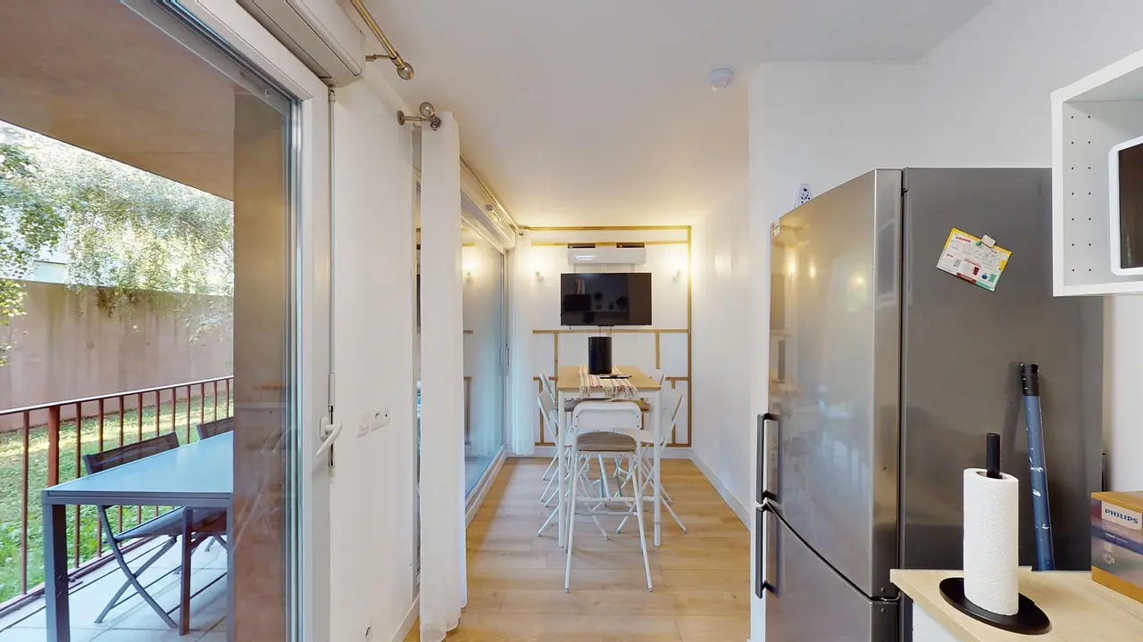 La colocation possède une pièce de vie composée en un espace salle à manger, une cuisine ouverte, le tout donnant sur un balcon. L'espace salle à manger est meublé avec une table à manger 4 personnes, ainsi qu'une télévision murale. La cuisine s'équipe du nécessaire : plaques de cuisson et hotte, machine à laver, four, micro-ondes, frigidaire avec compartiment congélateur ainsi que de nombreux rangements et ustensiles de cuisine.