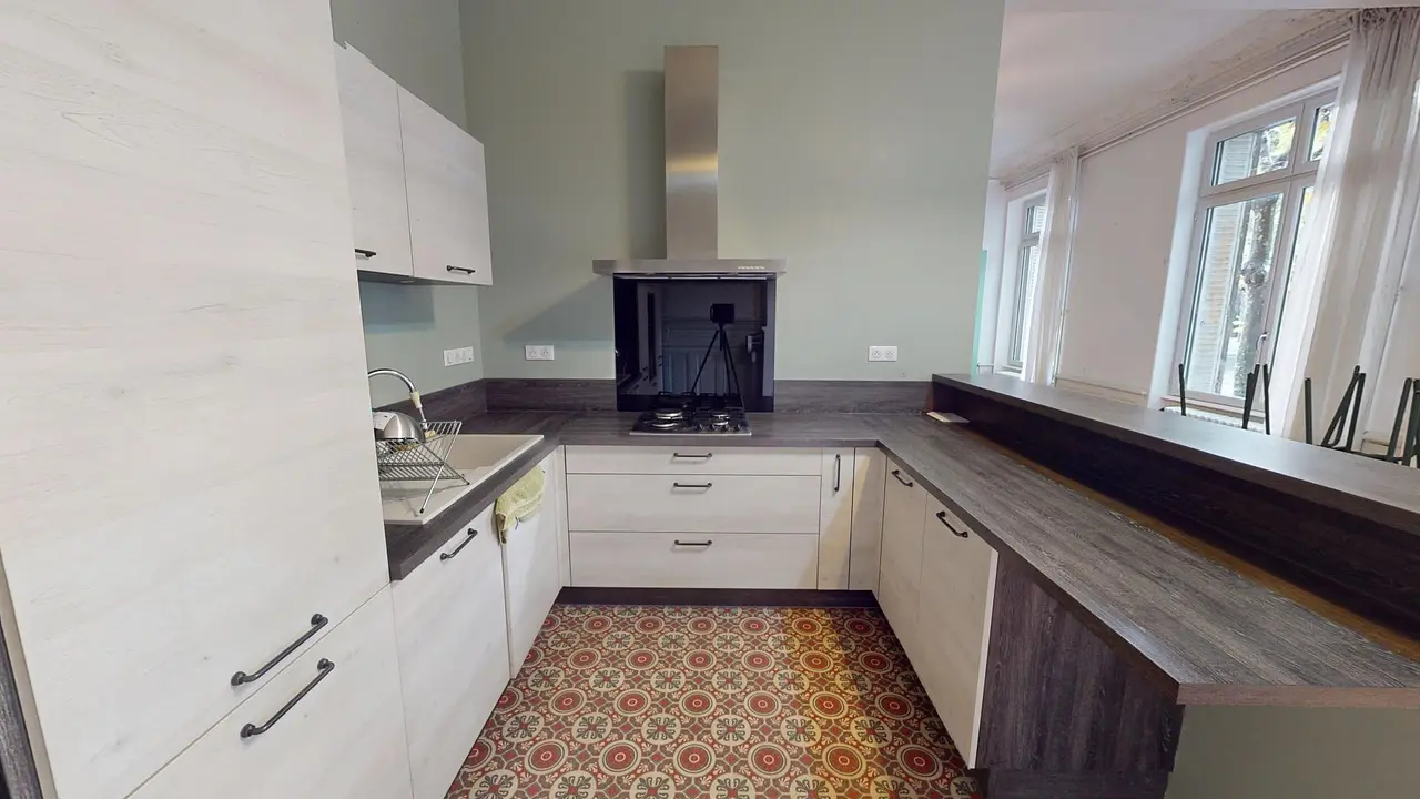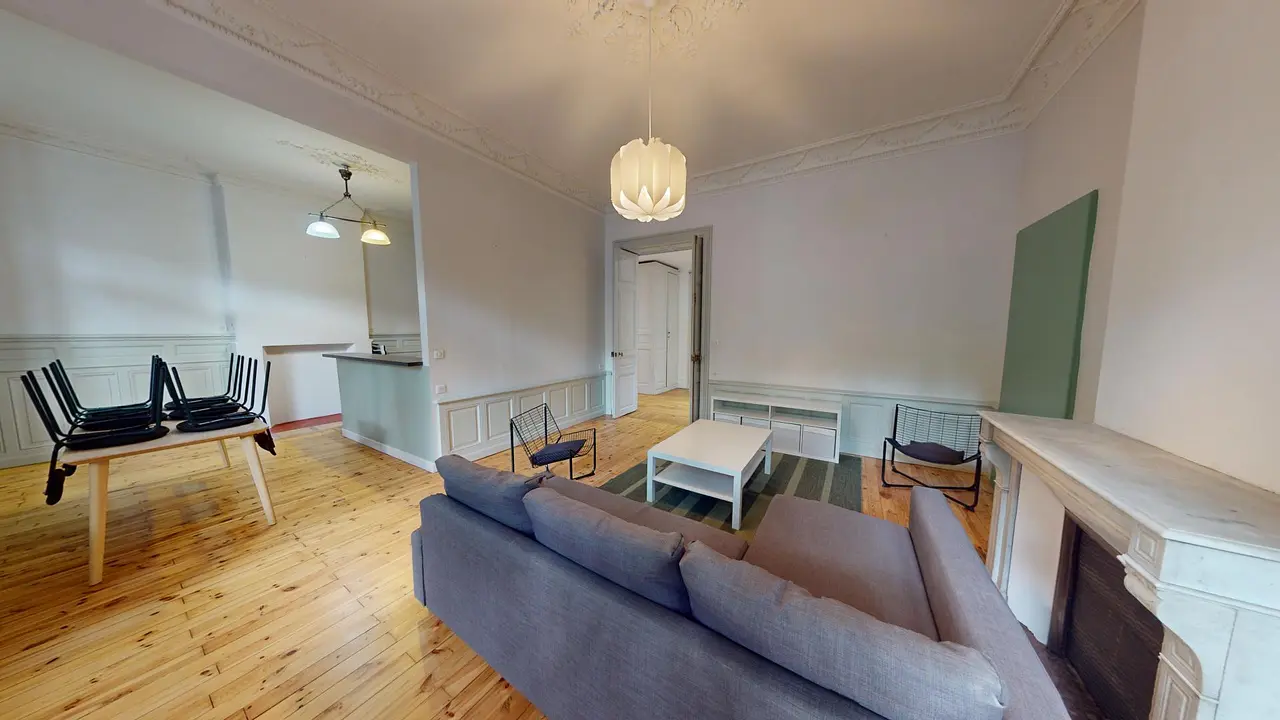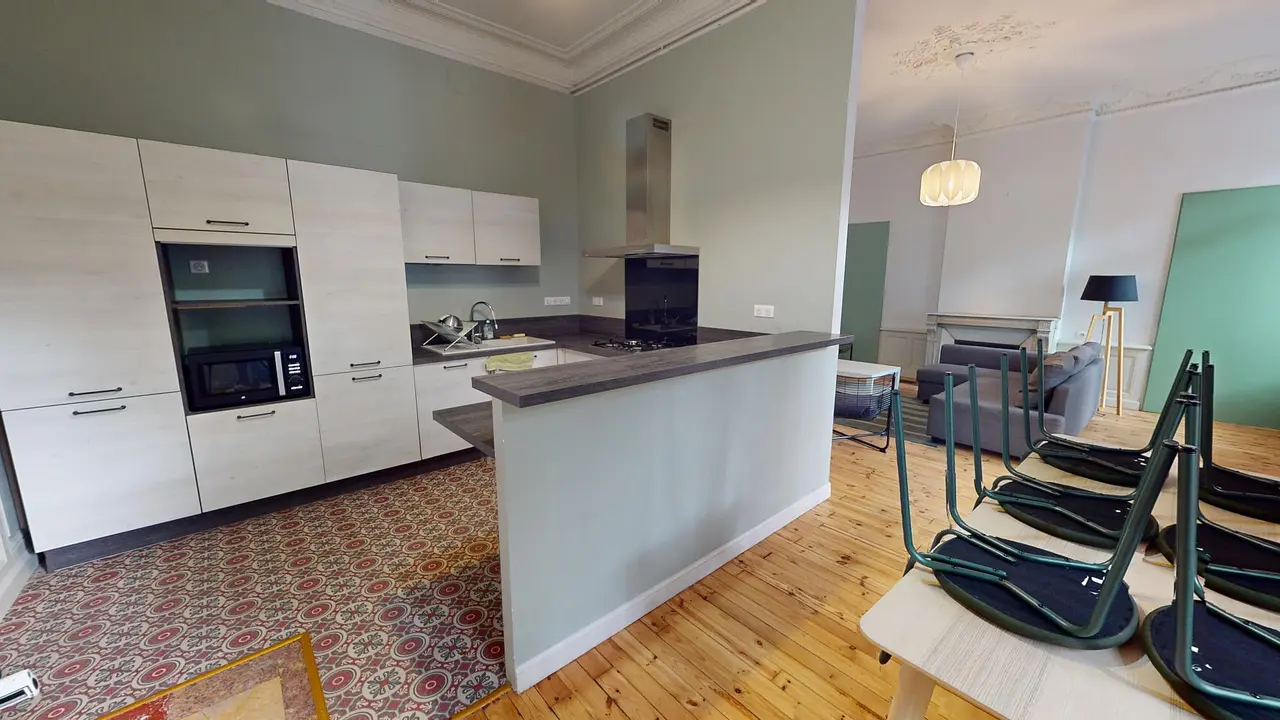 La colocation, spacieuse, propose une belle pièce de vie lumineuse meublée avec canapé d'angle, table basse, meuble TV et fauteuil. L'espace cuisine, entièrement équipée (four, plaques de cuisson, hotte, micro-ondes), comporte de nombreux rangements, plan de travail et mange-debout. Une table à manger 6 places est aussi installée.