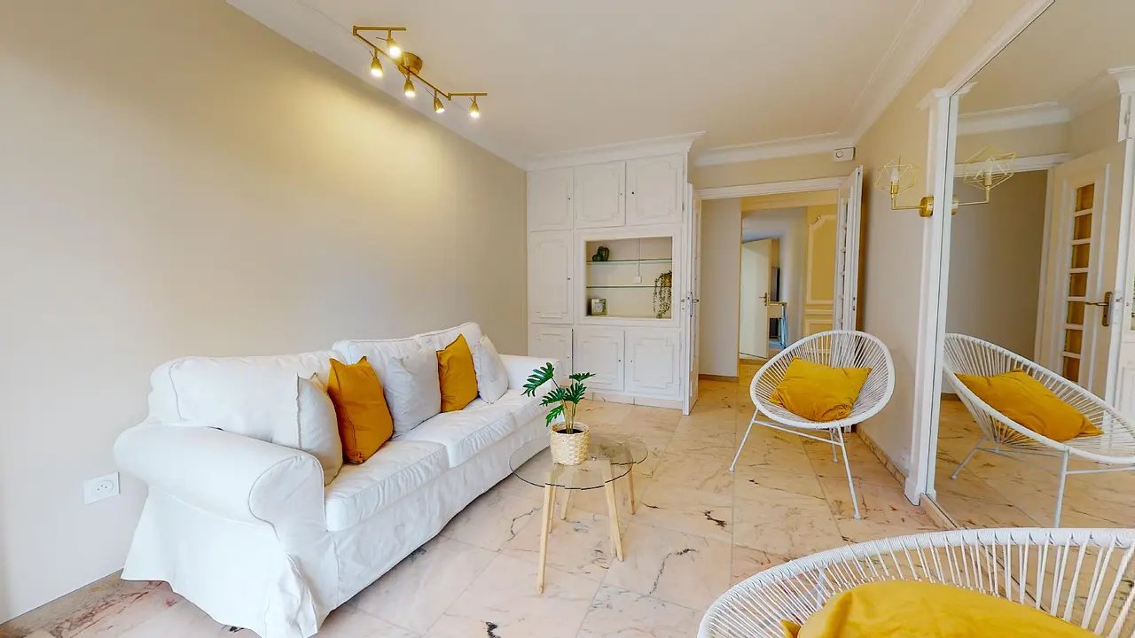 Sur la gauche, un joli salon lumineux se compose d'un canapé, d'une commode avec rangements, de tables basses et d'un grand miroir.