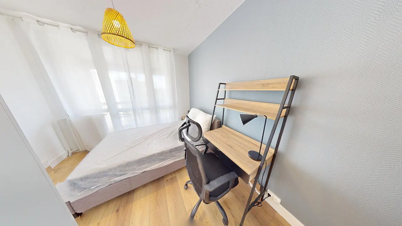 La chambre est louée avec un bureau, un lit deux places, un placard, un miroir ainsi qu'une grande fenêtre. La chambre dispose d'une salle d'eau privative avec un meuble vaque, une douche et un miroir.