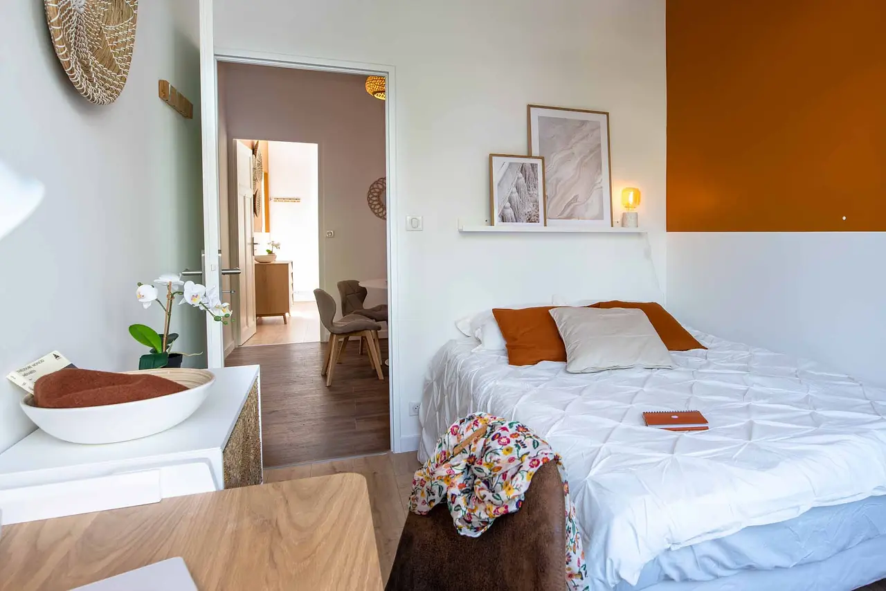 La chambre 4 est au milieu du couloir sur la gauche, elle est meublée d’un lit double, d’un bureau avec chaise, d'un meuble case et d'un grand placard pour ranger ses affaires. La chambre est très lumineuse et a été redécoré de manière moderne.