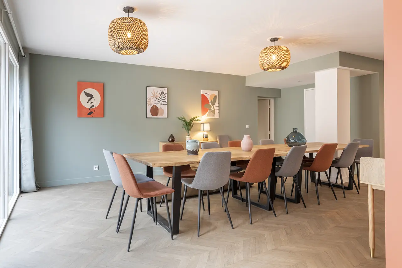 - Un espace repas, composé de deux grandes tables jointes, complétées par quatorze chaises et d'un buffet.