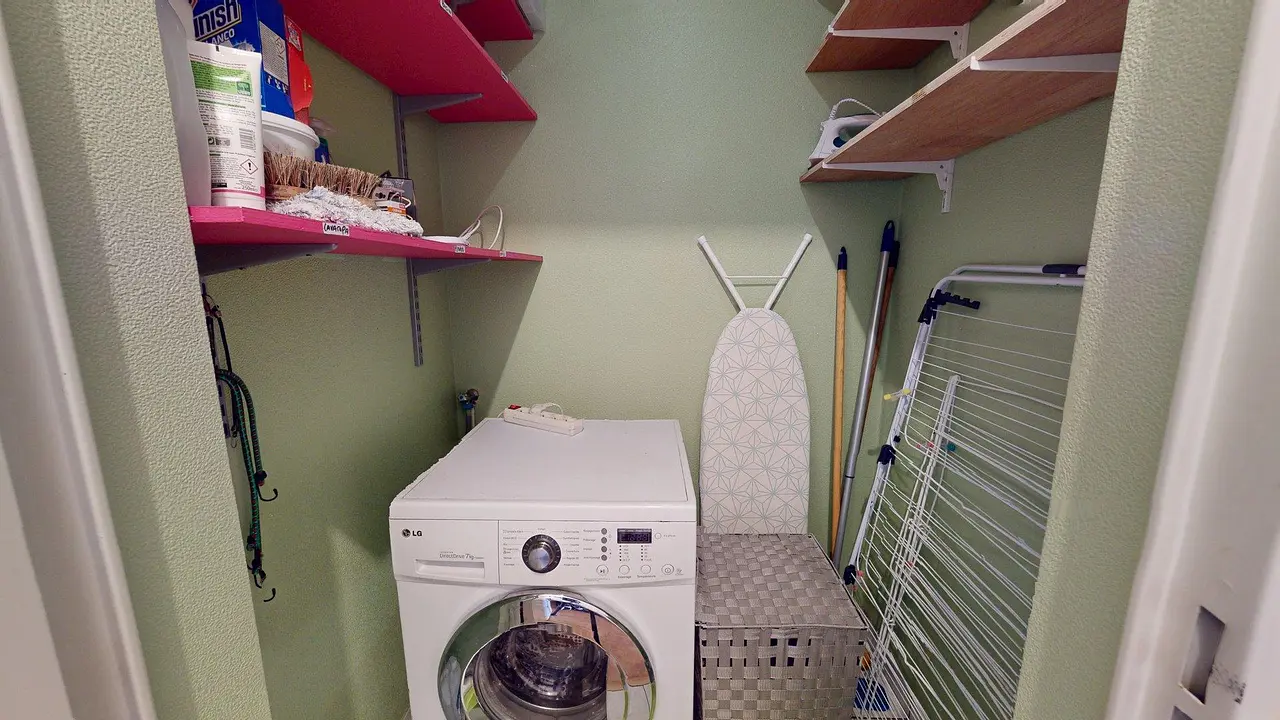 Enfin, une buanderie est à votre disposition, offrant un espace de rangement supplémentaire et équipée d’une machine à laver pour un confort optimal.La chambre est équipée d'un lit double, d'un bureau et d'un placard de rangement.