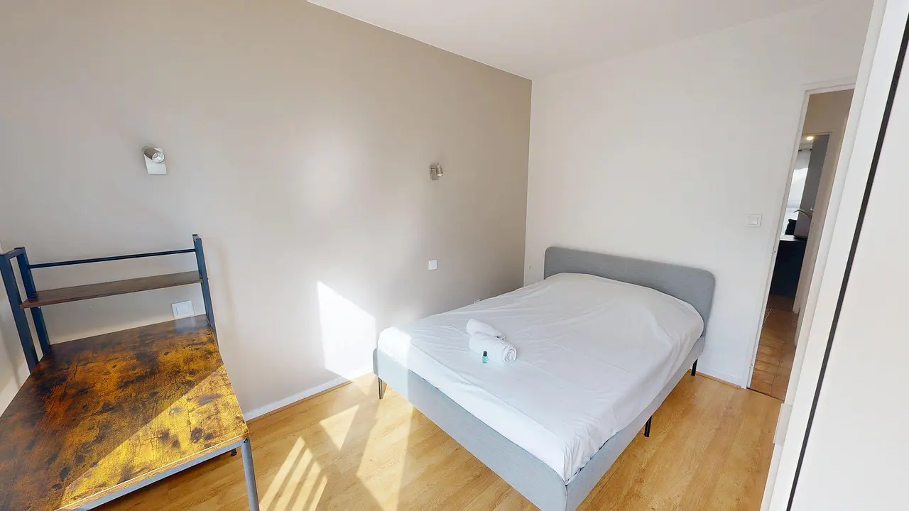 La chambre 3 dispose d'un lit double, d'un bureau accompagné de sa chaise, d'une armoire de rangement et d'une lampe de chevet.