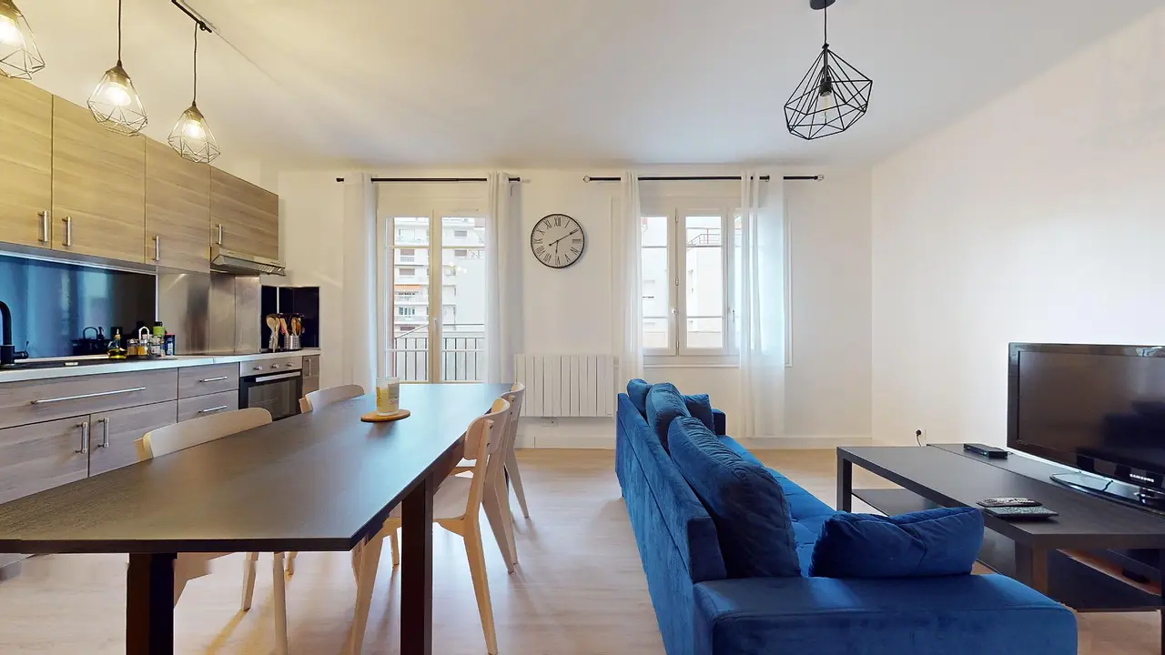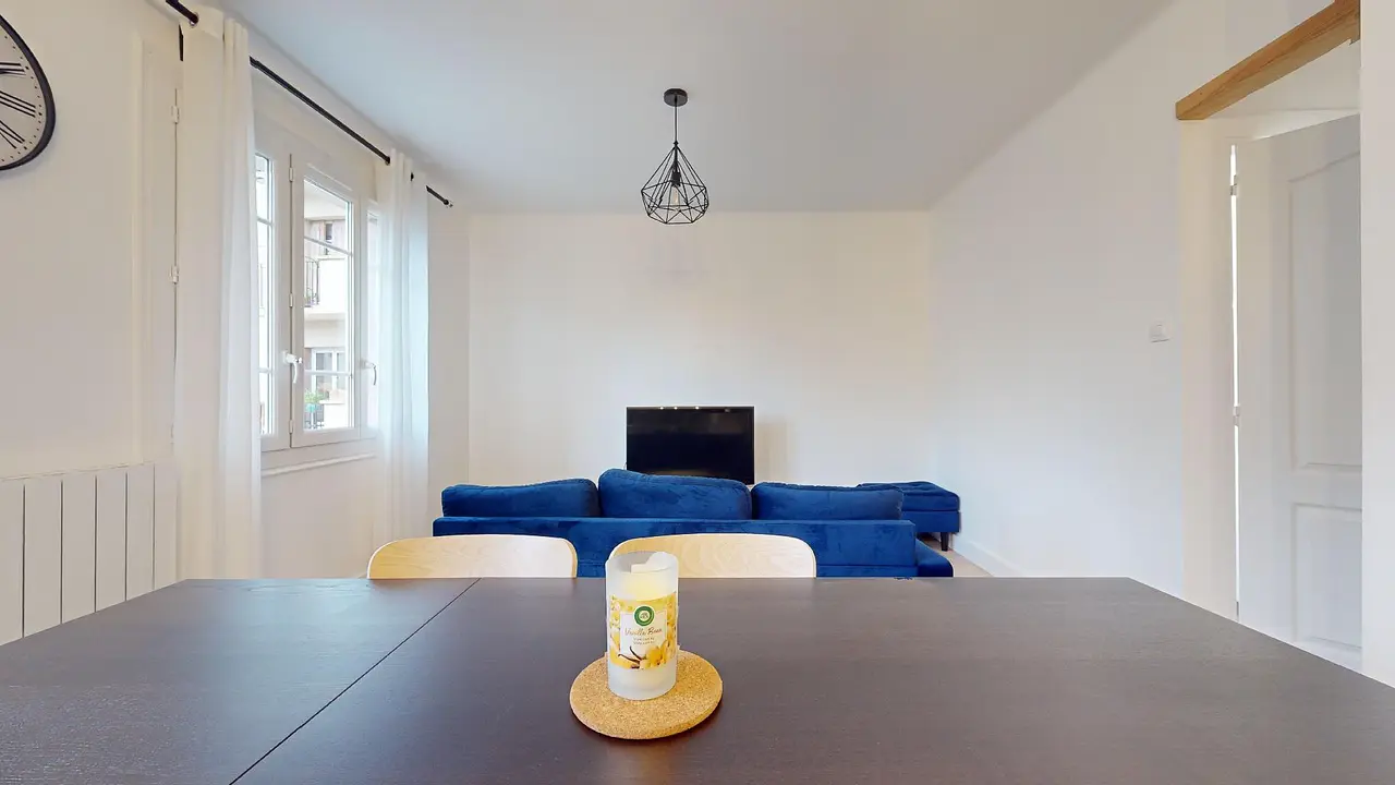 Le salon est aménagé d'un canapé, un pouf, une table basse, un meuble TV avec une télévision. La pièce accueille aussi une grande table avec quatre chaises, idéal pour partager des repas entre colocataires.