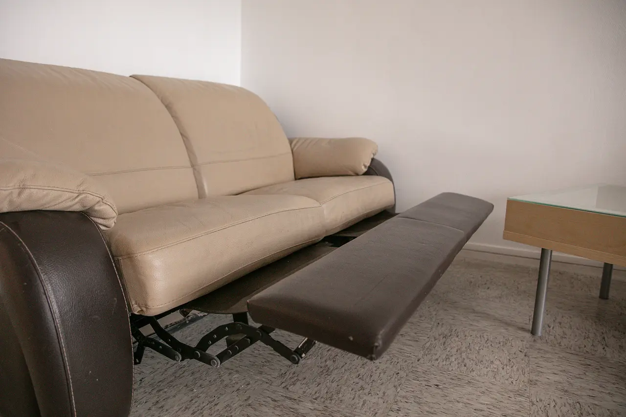Le salon est très lumineux, il dispose d'un canapé avec un fauteuil, une table avec quatre chaises, idéal pour partager des repas entre colocataires. Cette pièce a un accès direct sur un balcon partagé avec la cuisine. Cette dernière est équipée d'un réfrigérateur avec congélateur, un four, des plaques à induction avec une hotte, une bouilloire, un évier, une poubelle et de nombreux rangements.