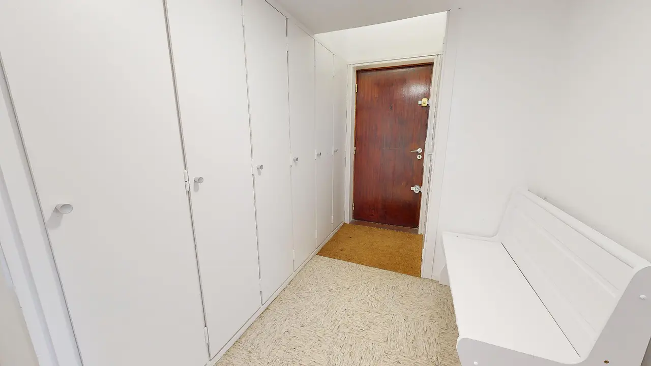 Cette colocation s'ouvre sur une entrée avec un banc et un grand placard mural offrant de nombreux rangements.