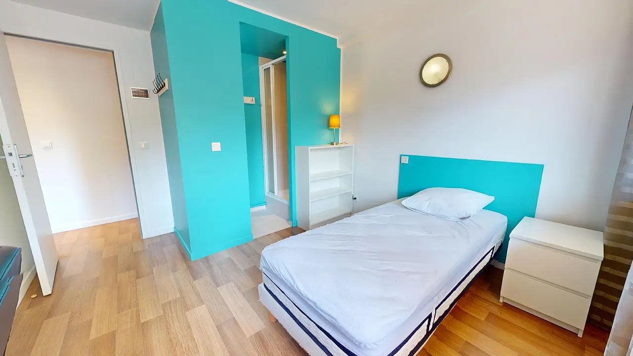 Chaque chambre dispose d'un lit simple, bureau, espaces de rangement ainsi qu'une salle de bain privative avec douche et meuble vasque.