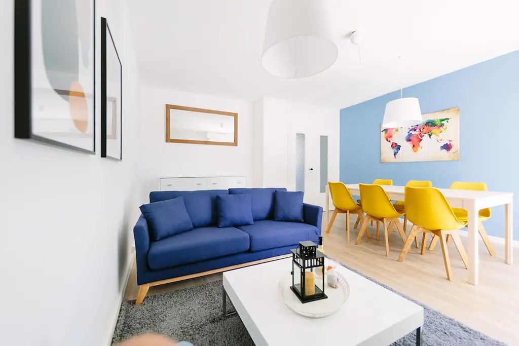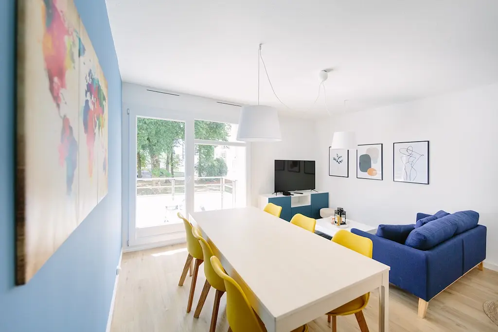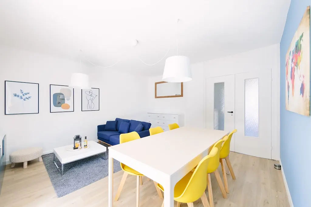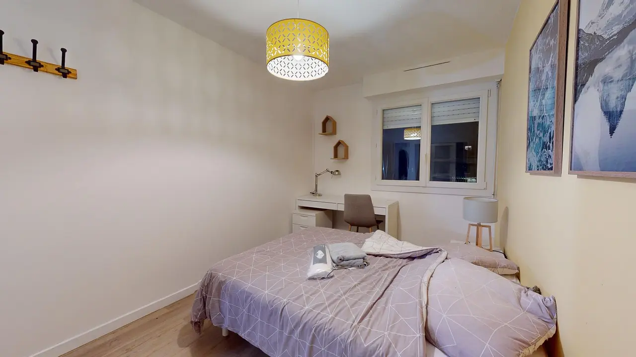 Cette colocation de cinq chambres s’ouvre sur une pièce de vie aménagée d’un canapé, d’une table basse, d’un meuble TV avec une télévision, un pouf, un buffet ainsi que d’une table avec six chaises, idéal pour partager des repas entre colocataires.