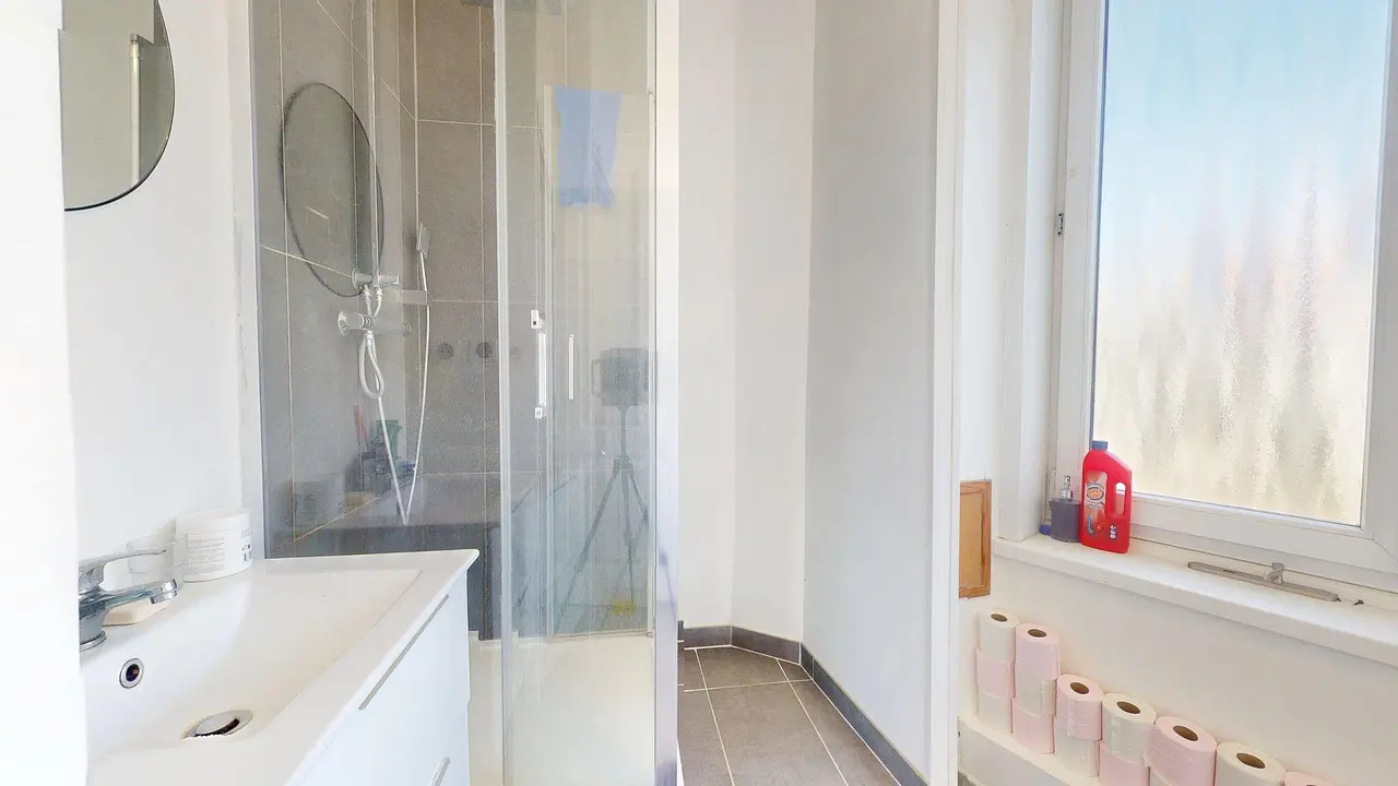 La salle d'eau comporte une douche, un meuble vasque avec miroir, ainsi que des toilettes.