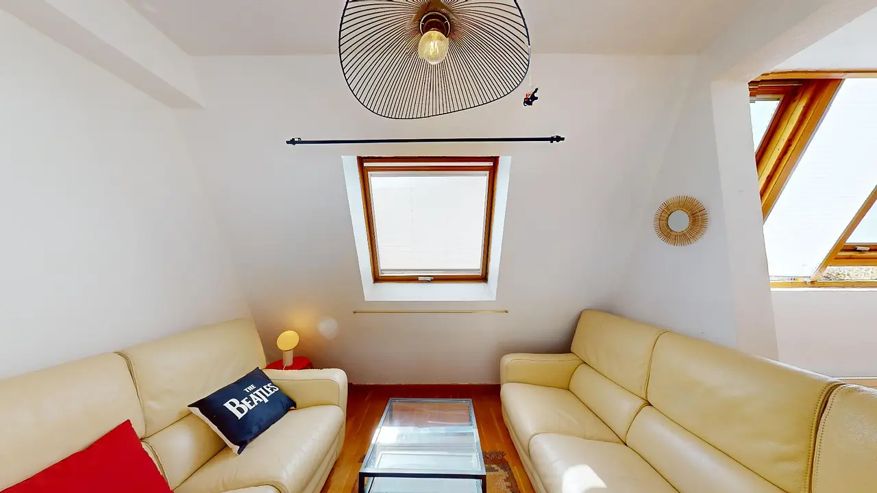 L'appartement offre une spacieuse pièce de vie sous les combles, comprenant une salle à manger, un salon avec deux canapés, et de généreux espaces de rangement. La cuisine, séparée de l'espace principal, s'ouvre sur un balcon et est entièrement équipée avec un lave-vaisselle, un réfrigérateur, une plaque de cuisson, une hotte, un four à micro-ondes, ainsi que de nombreux placards de rangement.