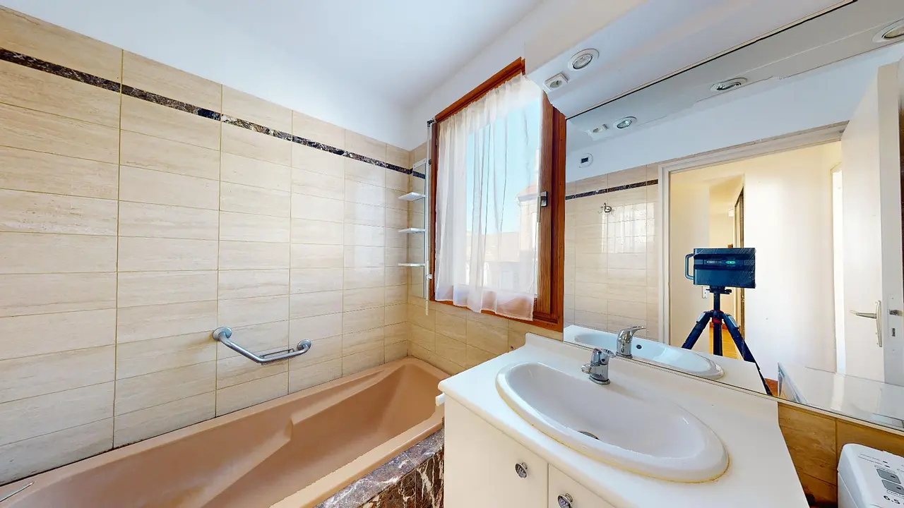 Ce logement dispose de deux salles de bains, dont une est attenante à la chambre principale, tandis que l'autre est partagée entre les deux autres colocataires.
