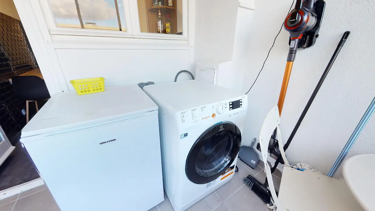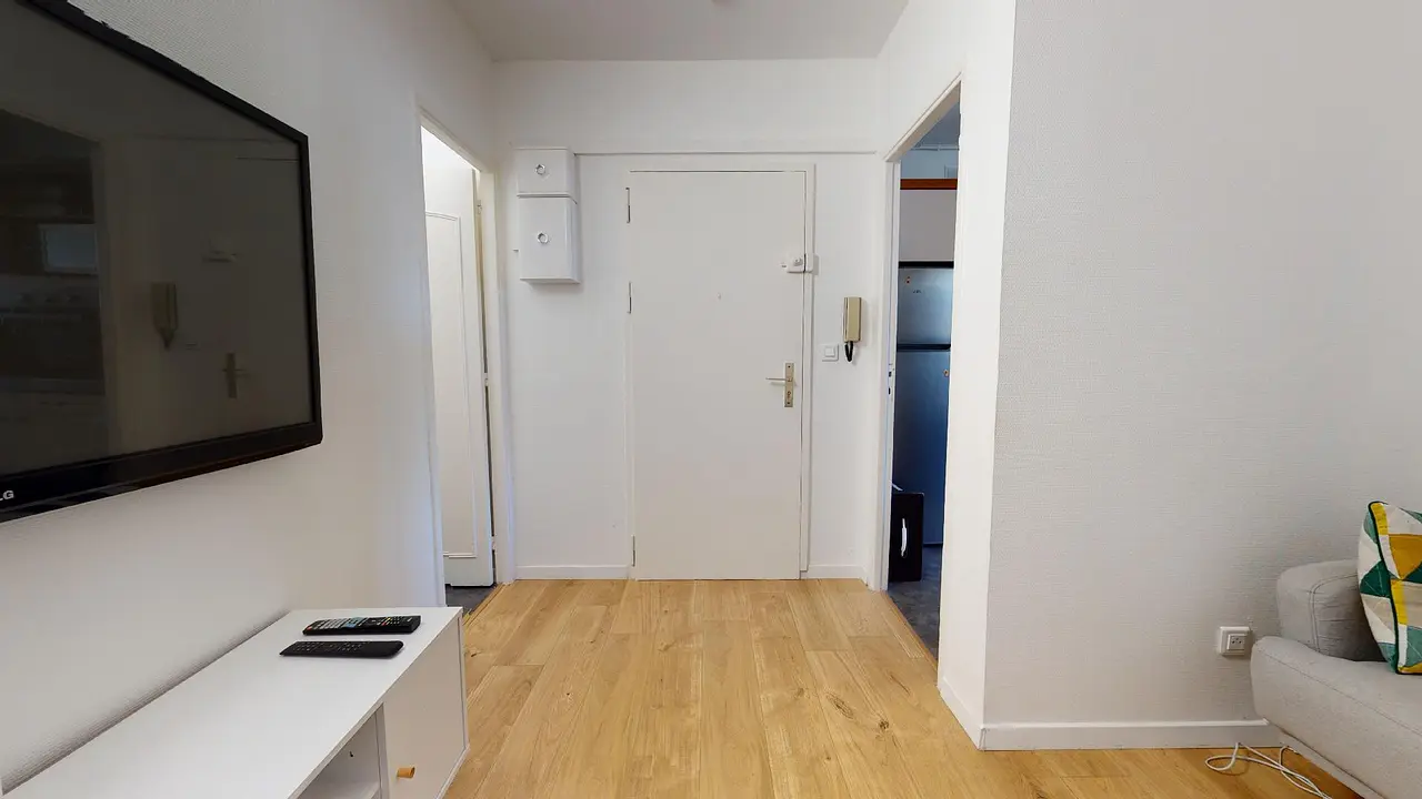 L'appartement de 5 pièces est aménagé comme suit : un salon équipé d'un canapé ainsi que d'une télévision, trois chambres, une cuisine et une salle de bains avec douche et meuble vasque.