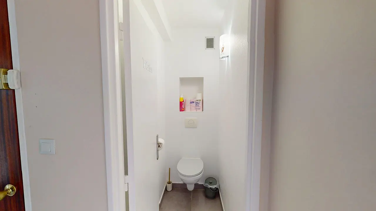 La salle de bain comprend une baignoire, un meuble vasque avec miroir ainsi que plusieurs rangements. Les WC sont séparés.