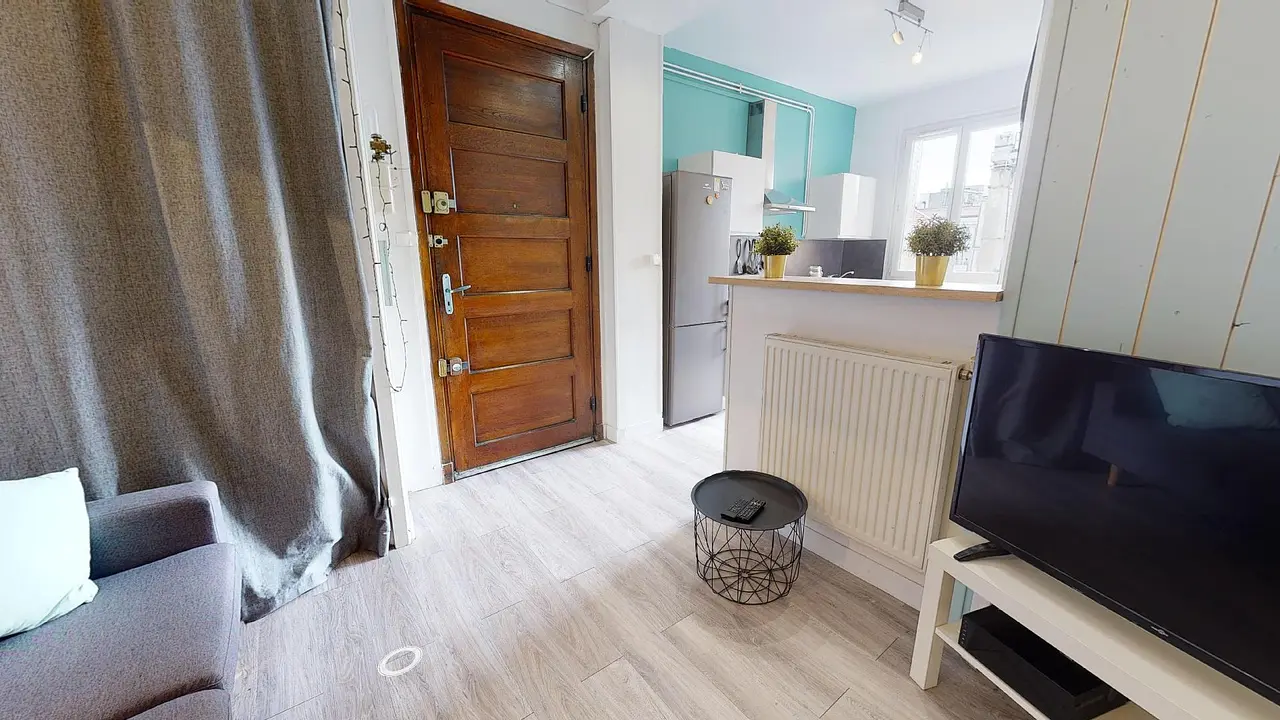 Il se compose de trois chambres, d’une salle de bain, de toilettes séparées et d’une cuisine équipée séparée du coin salon par un comptoir avec deux tabourets de bar. Un parquet flottant en bois a été posé dans tout l’appartement, les chambres y compris, et rend les pièces très lumineuses.