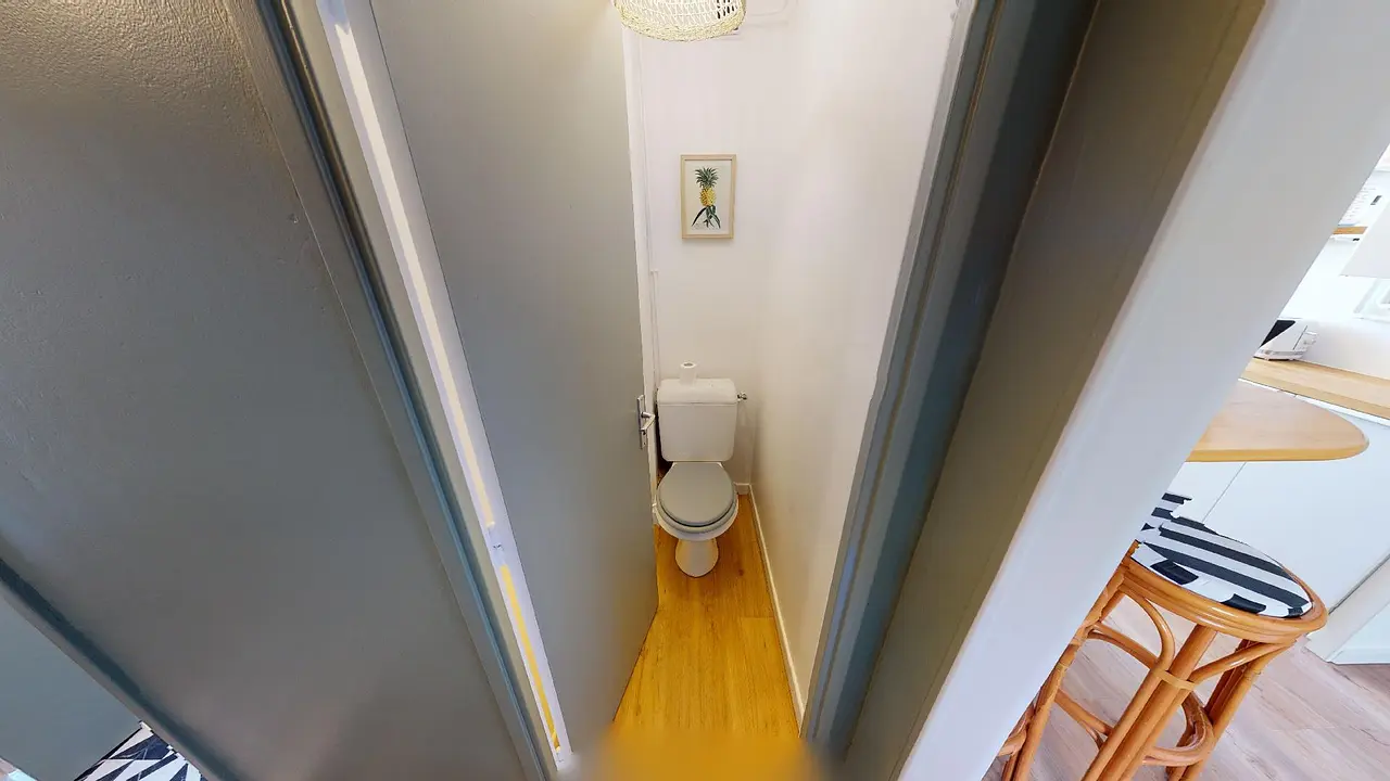Une salle de bain avec machine à laver, meuble vasque, douche et loggia ainsi que des WC séparés viennent compléter ce logement.
