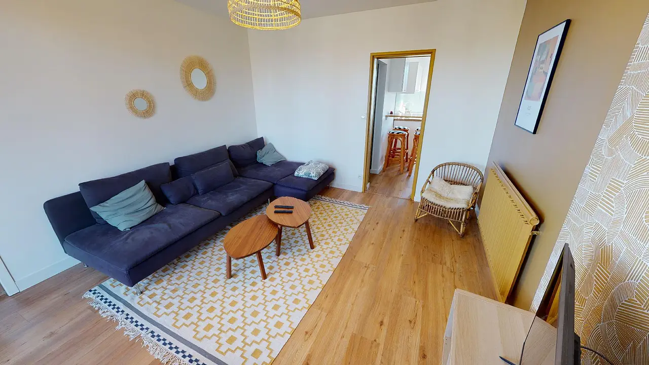 Cette colocation comporte un salon lumineux avec un canapé, des tables basses, une TV, un fauteuil, etc. Ce salon offre un accès direct à un balcon offrant une vue dégagée très appréciable durant les beaux jours.