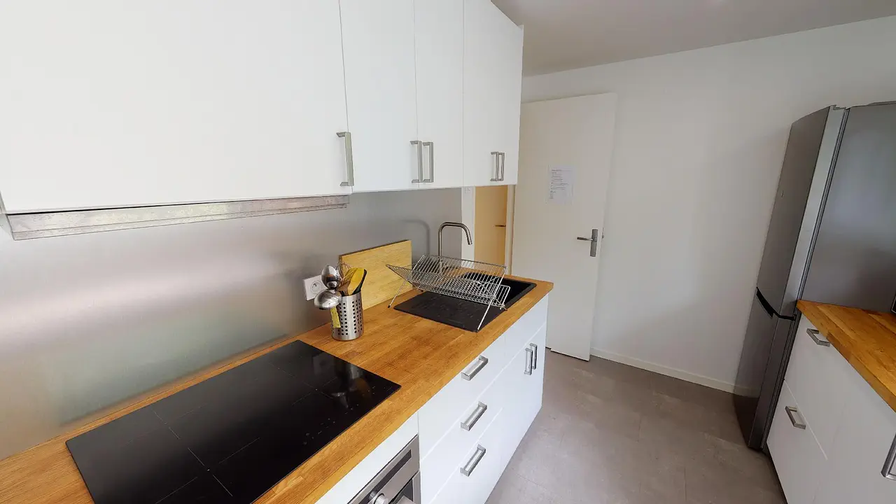 Enfin, la cuisine est équipée avec frigo, micro-ondes, table à manger, four, plaques de cuisson, hotte, évier ainsi que de nombreux rangements.