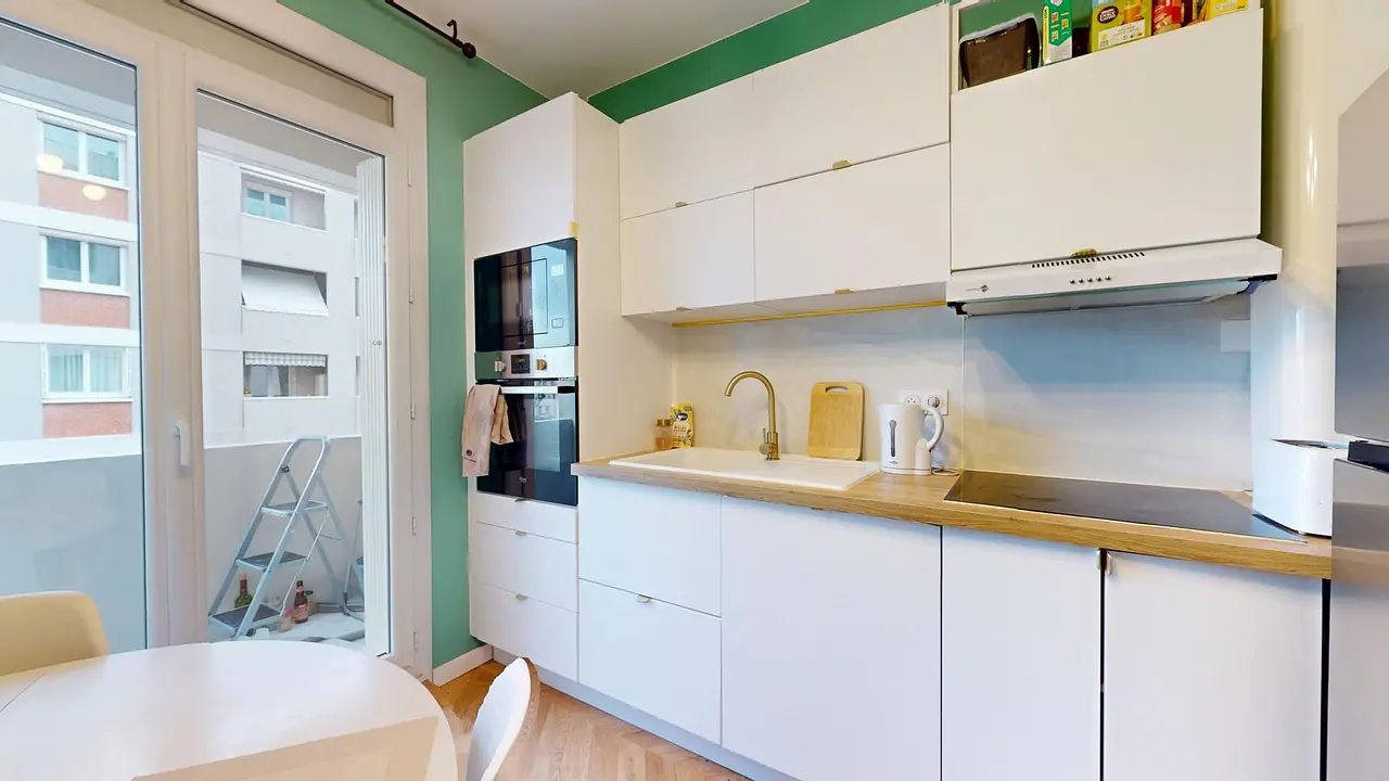 La cuisine ouverte, moderne et bien équipée, dispose d’un four, d’un micro-ondes, de plaques de cuisson, d’une hotte, d’un évier, d’un réfrigérateur avec compartiment congélateur, d’un lave-vaisselle, ainsi que de nombreux rangements et ustensiles de cuisine. Une table permet d’accueillir jusqu’à quatre personnes pour vos repas partagés. La cuisine donne également accès à un petit balcon agréable, parfait pour prendre l’air.